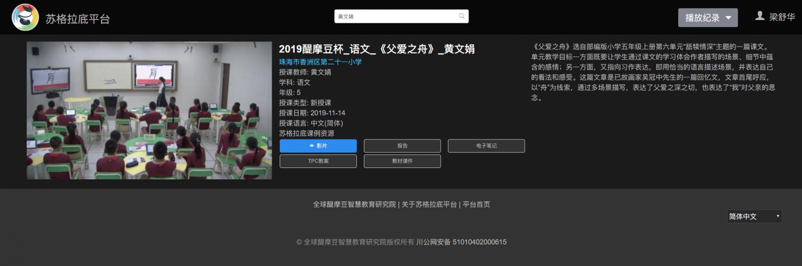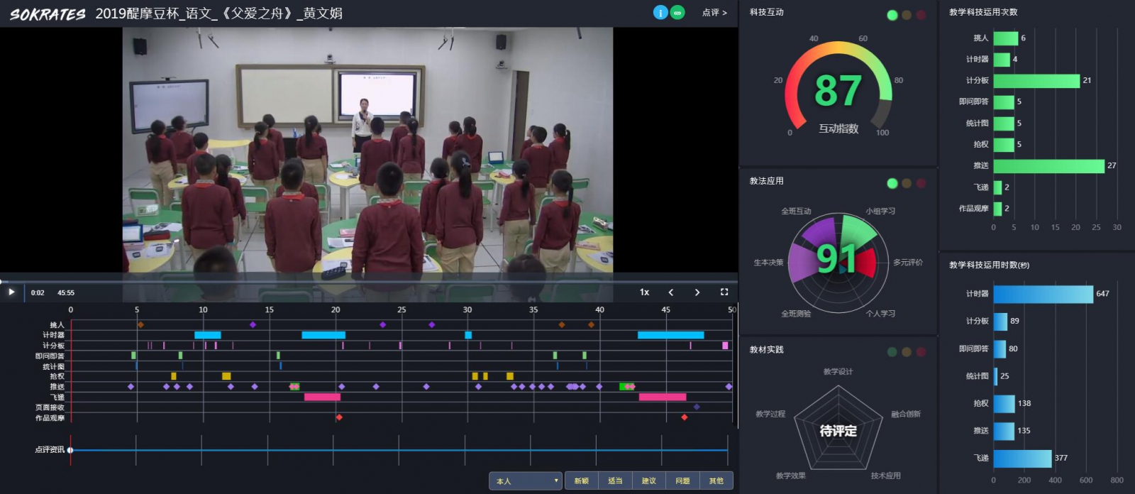 作品《父愛之舟》選自部編版五上第六單元的同名課文。其以“舟”為線索,通過多場(chǎng)景描寫,首尾呼應(yīng)地表達(dá)了父愛之深切,也表達(dá)了“我”對(duì)父親的追思。這節(jié)課以智慧課堂的蘇格拉底數(shù)據(jù)為依托,從而以生為本及時(shí)調(diào)整課堂教學(xué)策略,又借助醍魔豆智慧教室多功能教學(xué)輔助手段,落實(shí)課堂上各個(gè)擊破,培優(yōu)扶困的措施。同時(shí)在“巧問揭題”“先導(dǎo)后學(xué)”“總結(jié)遷移”的課堂環(huán)節(jié)中把課堂交還學(xué)生,讓學(xué)生在自主、合作、探究中實(shí)現(xiàn)課堂的有效生成。既讓學(xué)生體會(huì)作者描寫的場(chǎng)景、細(xì)節(jié)中蘊(yùn)含的感情,又指向習(xí)作表達(dá),即用恰當(dāng)?shù)恼Z言描述場(chǎng)景并表達(dá)自己的看法和感受。