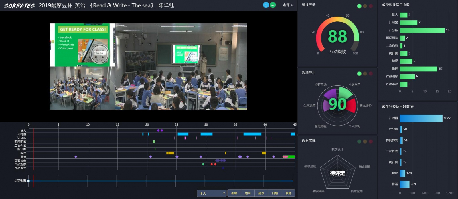 自主學習與實驗探究能力,以及分享表達能力。其中,陳洋鈺老師巧妙地通過交叉使用醍魔豆智慧教學系統(tǒng)中的挑人,計時器,計分板,即問即答,二次作答,統(tǒng)計圖,搶權(quán),推送,飛遞,作品觀摩等功能,使學生能夠?qū)Ρ竟?jié)讀寫結(jié)合課產(chǎn)生極大的學習興趣,同時智慧教學新方式給予學生更大的學習專注度。
