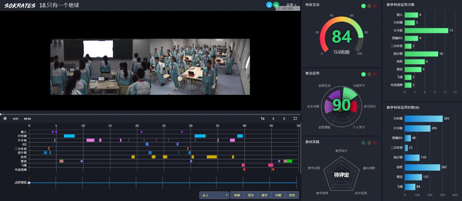 宋芳老師從回顧上一節(jié)課出發(fā),通過對課文的內(nèi)容梳理、復(fù)習(xí)帶入課程主題,首先,她用IRS先進(jìn)行前測,并依據(jù)作答挑人,引起學(xué)生主動產(chǎn)生探索“只有一個地球”的想法。