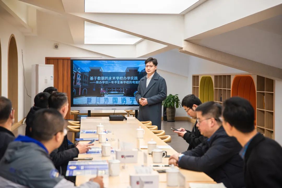 初中部陳旭校長向參訪團(tuán)介紹了醍摩豆智慧教育在新川的建設(shè)及使用情況。