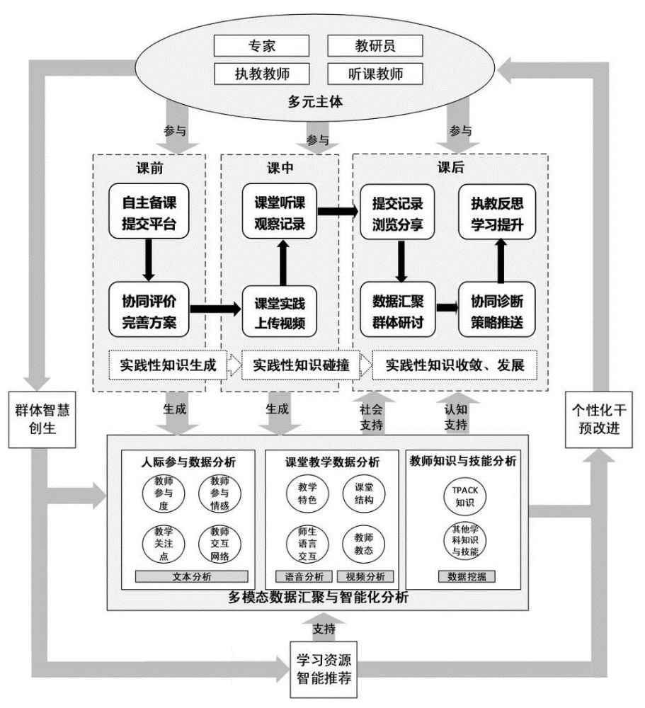 為突破傳統(tǒng)教研的局部評估、延時(shí)反饋、課感決策等局限,我校開展基于醍摩豆AI蘇格拉底系統(tǒng)的智慧教研,實(shí)現(xiàn)了智慧教研的全面評估、同步反饋、數(shù)據(jù)決策。在課前、課中、課后等關(guān)鍵時(shí)間階段,專家、教研員、執(zhí)教教師和聽課教師組成的多元主體同步參與,應(yīng)用平臺的相關(guān)模塊與功能,充分參與集體備課、上課實(shí)踐、協(xié)同聽評課、深度反思等教研活動(dòng),并對人際參與數(shù)據(jù)、課堂教學(xué)數(shù)據(jù)、教師知識與技能數(shù)據(jù)自動(dòng)化分析,分析結(jié)果以可視化報(bào)告的形式呈現(xiàn),為教師群體協(xié)同教研、個(gè)體反思與改進(jìn)自我提供全面清晰的參考與反饋。