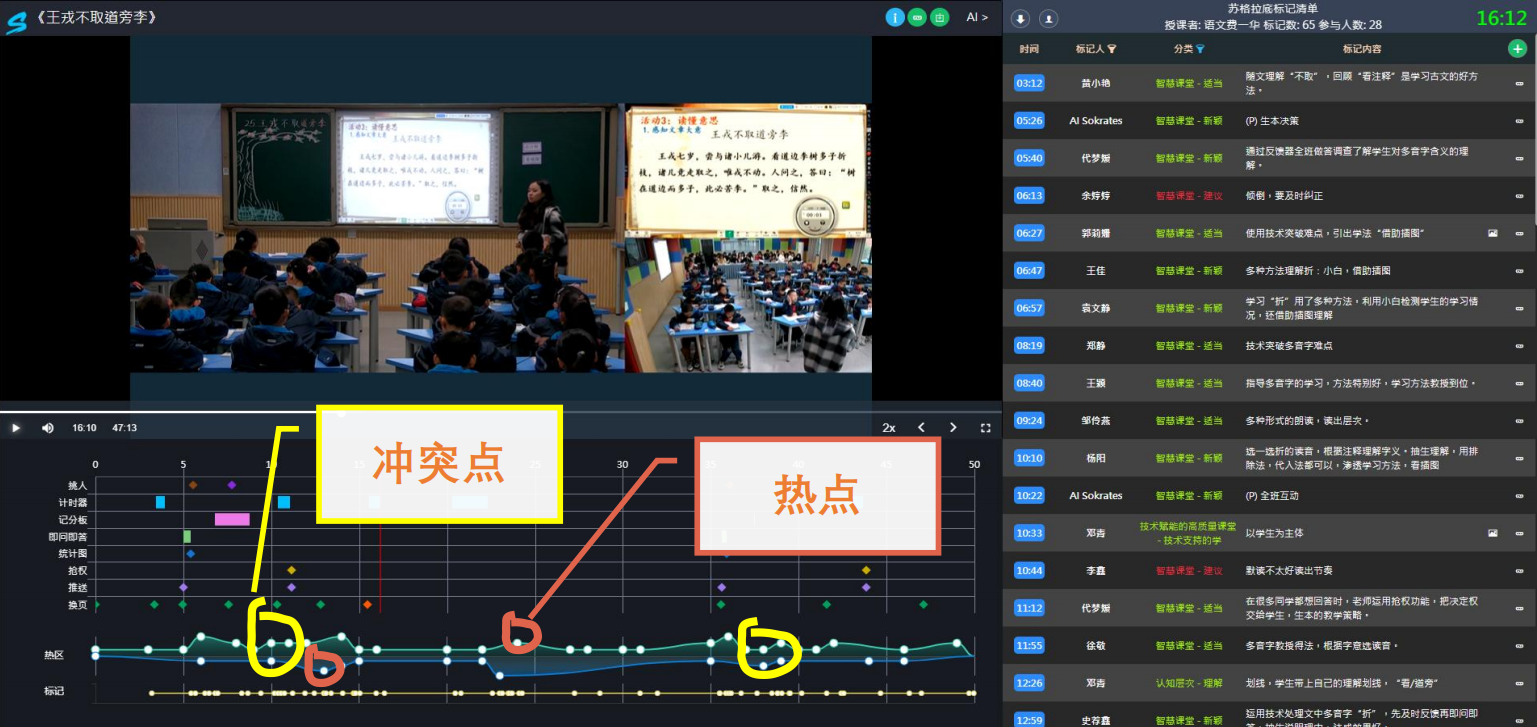 合研:上課完畢后,教師分小組結(jié)合觀察量表開展討論,分別從學(xué)生專注與表達(dá)、教師關(guān)鍵問(wèn)題提出、課堂技術(shù)運(yùn)用等維度進(jìn)行研討,并整理歸納分小組上傳至平臺(tái)打點(diǎn)記錄中。
