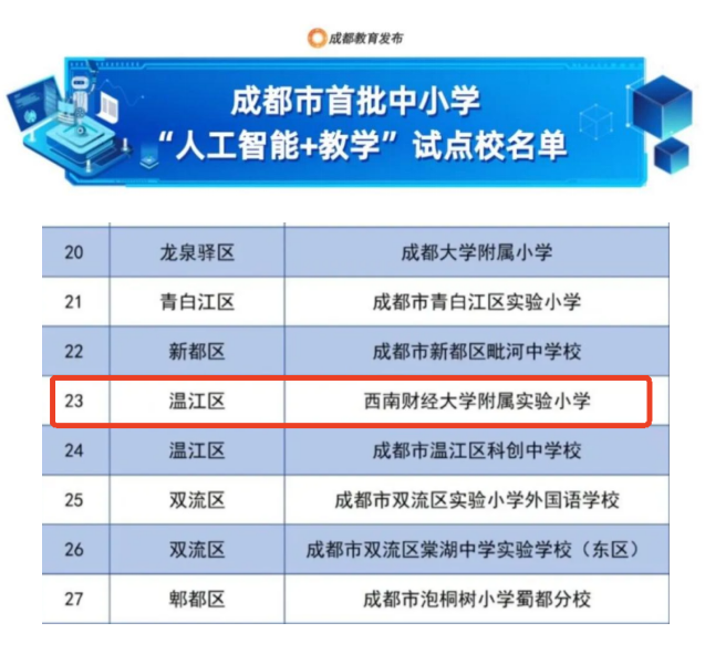 2025年初春,西南財(cái)經(jīng)大學(xué)附屬實(shí)驗(yàn)小學(xué)成功入選成都市首批中小學(xué)“人工智能+教學(xué)”試點(diǎn)校,并受到四川教育新聞、金溫江的關(guān)注與報(bào)道。