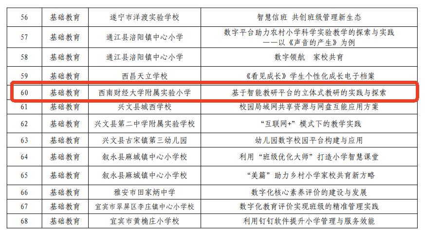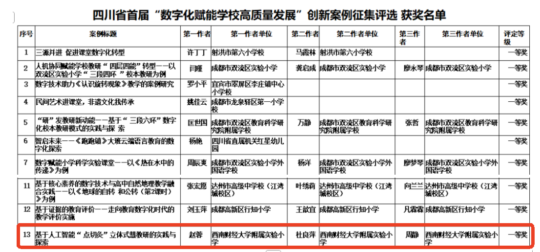 基于實(shí)踐的案例《基于人工智能“點(diǎn)切灸”立體式慧教研的實(shí)踐與探索》更是成績(jī)斐然,榮獲四川省首屆“數(shù)字賦能學(xué)校高質(zhì)量發(fā)展”創(chuàng)新案例征集一等獎(jiǎng),還獲評(píng)四川省2024年數(shù)字校園應(yīng)用場(chǎng)景案例征集優(yōu)秀案例。