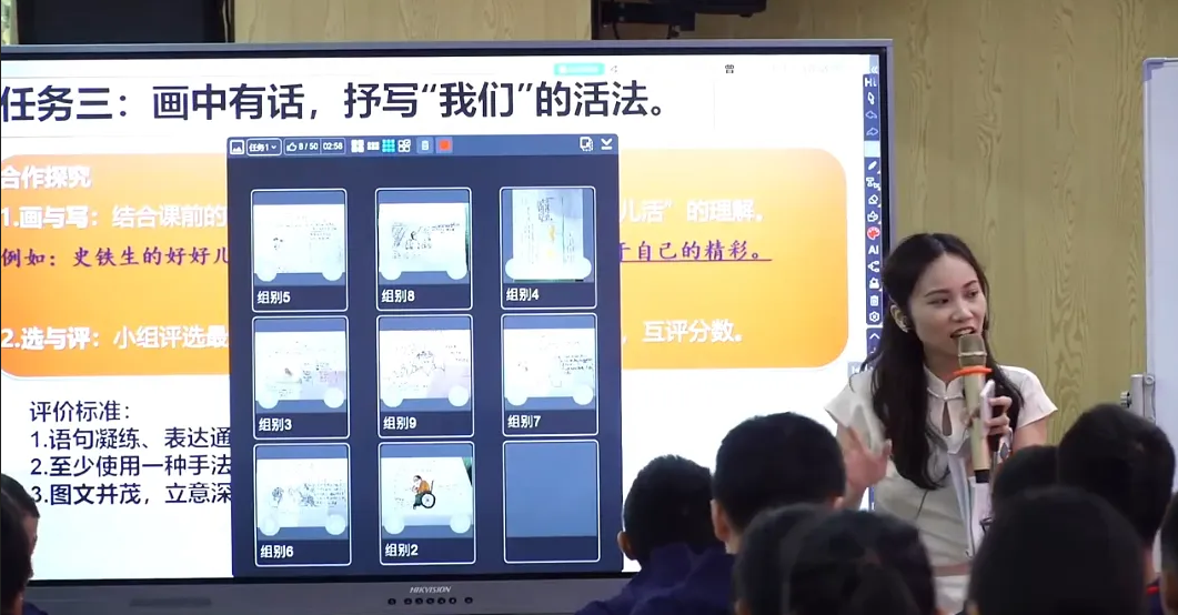 曾絲雨老師在一輪基礎(chǔ)教育課程改革中小學語文學科課程建設(shè)之特級教師走進成都青羊研討活動”中,進行公開課展示,她善用HiTeach 5智慧教學系統(tǒng)的即問即答、作品觀摩、智慧互評等工具,數(shù)字賦能,帶領(lǐng)學生探究課文,領(lǐng)悟生命。