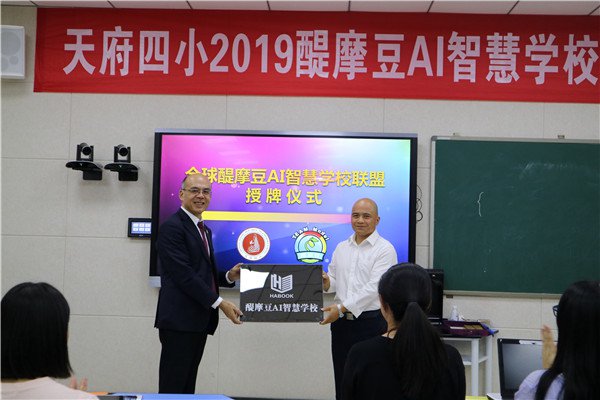 19年4月,天府四小成為全球首批AI智慧學(xué)校聯(lián)盟校,吳權(quán)威教授、陳剛校長(zhǎng)一同參與學(xué)校智慧課堂教研和授牌儀式。