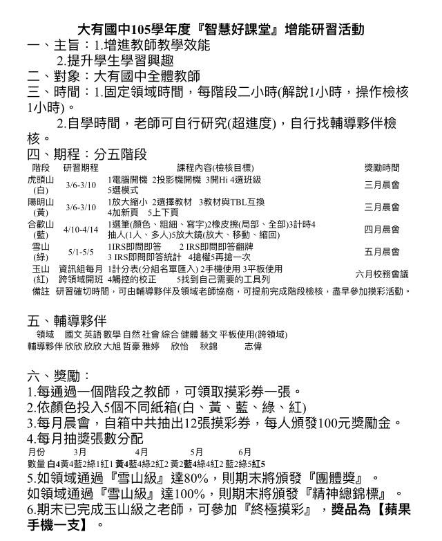 校長於巡堂時看到老師使用智慧教室,會給予桃園市政府教育局頒發(fā)的績優(yōu)狀。此外,為了激起老師們對于智慧教室的學習動機,由大有國中嫻熟智慧教室支持系統(tǒng)的七年級教師共同組成委員會,擬定了“登山計劃”?!暗巧接媱潯睂⒅腔劢淌沂褂脵z核目標分為五階段,如同破關卡游戲一樣以臺灣五座山的高度設置難度,每位老師需向委員會提出登山申請,再經(jīng)由委員會觀看老師實際操作的情況來決定審核是否通過。通過一座山的認證,就能夠取得一張摸彩卷在每月中參加摸彩。而通過玉山級(最高)的認證更能夠於學期末摸大獎,獎項是iPhone7跟平板電腦!另外,只要各領域的所有教師都通過雪山級的專家委員認證,該領域所有教師人人都可以獲得一張飯店下午茶券,并得到”精神總錦鏢”。互相激勵,互相學習,讓老師們借由“登山計劃”熟悉使用智慧教室,并且給予獎勵,在大有,教師專業(yè)成長好幸福!