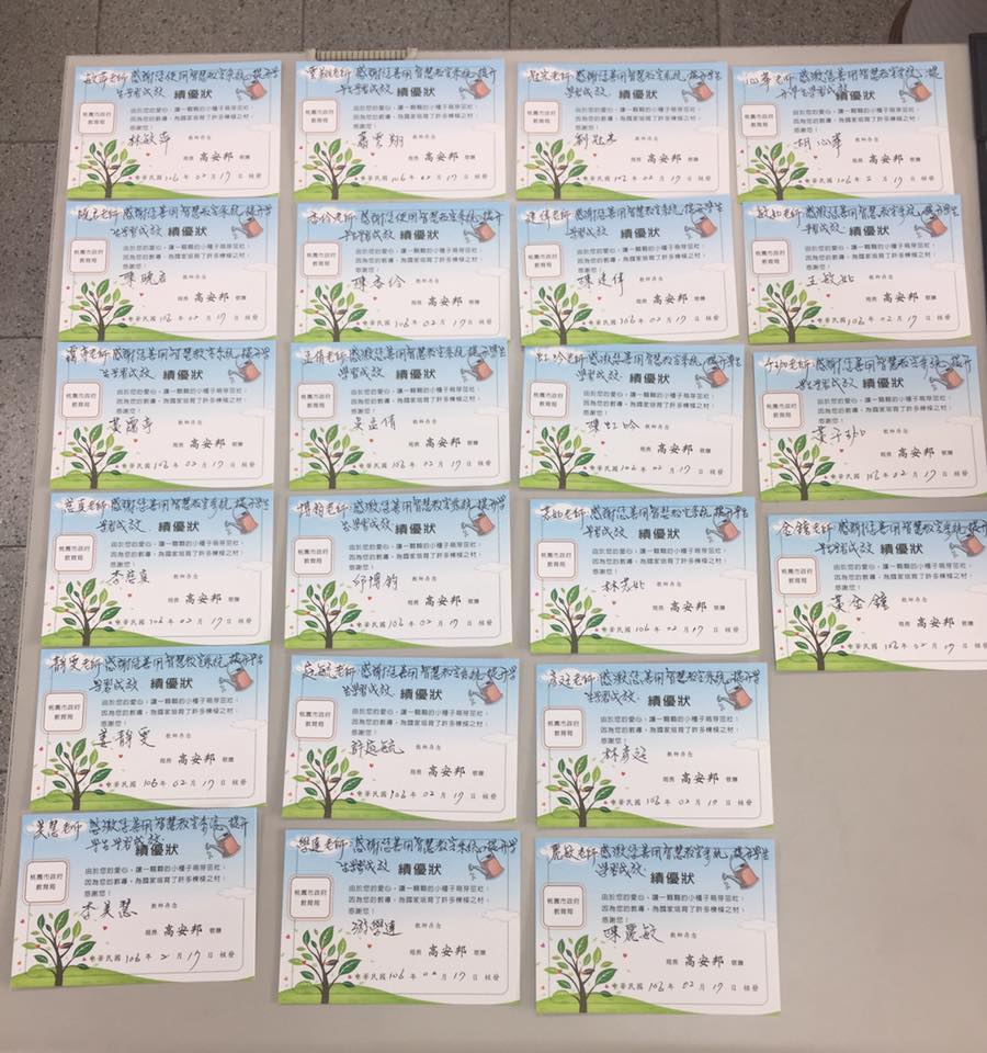 校長於巡堂時看到老師使用智慧教室,將給予桃園市政府教育局頒發(fā)的績優(yōu)狀此外,為了培養(yǎng)更多優(yōu)秀的智慧教師,陳家祥校長提出科技領導理念5原則,加速智慧教師精進教學,專業(yè)成長。
