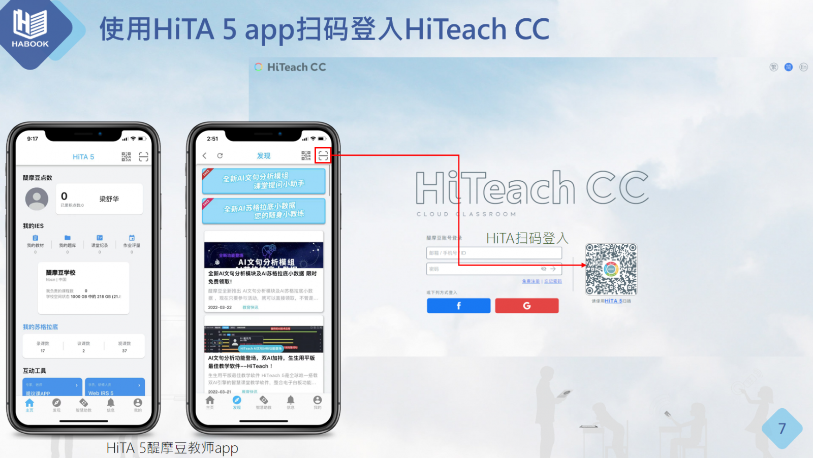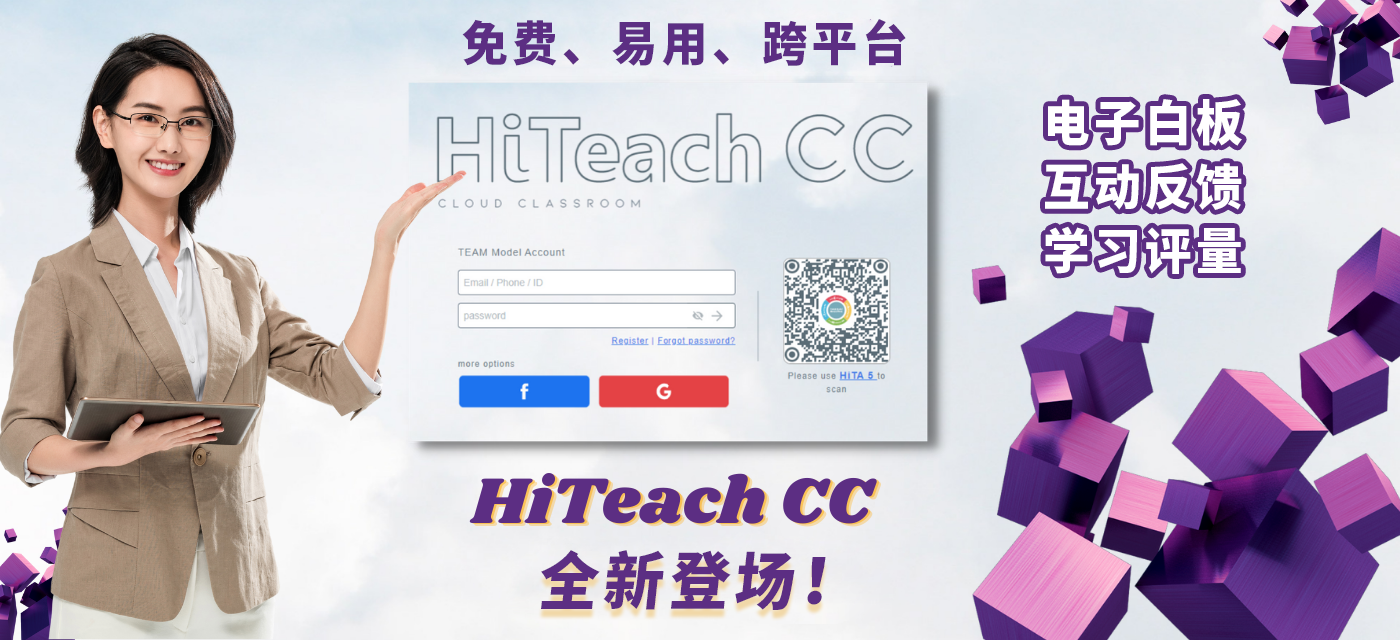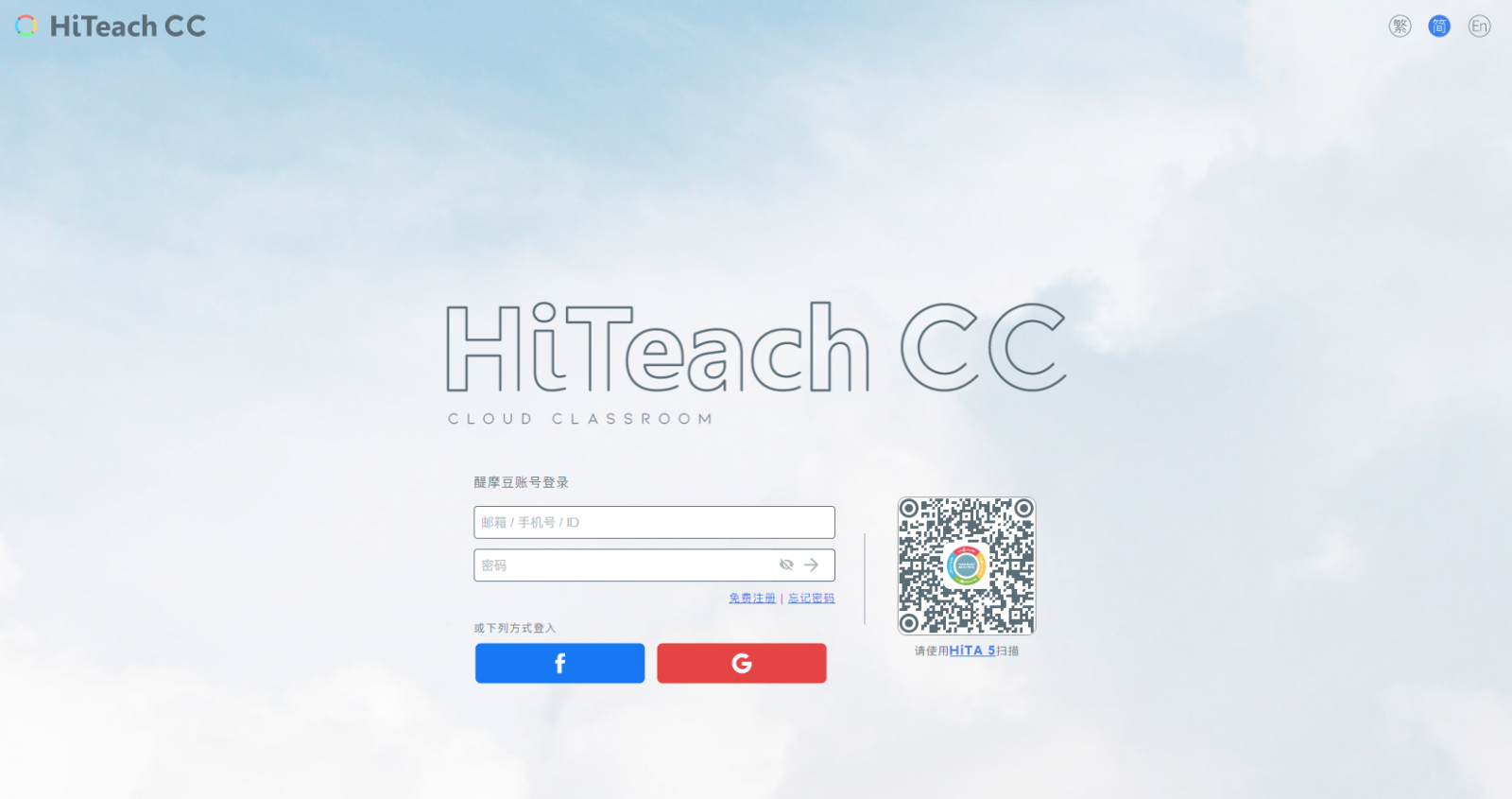 HiTeach CC目前免費開放給教師個人申請使用,可以使用第三方賬號注冊與登入HiTeach CC。若要使用更多的學生連線數(shù),請在手機上安裝HiTA 5 app,使用HiTA來掃描登入HiTeach CC,不僅方便,在HiTA上還能夠收到更多教育信息,或者應用更多功能。