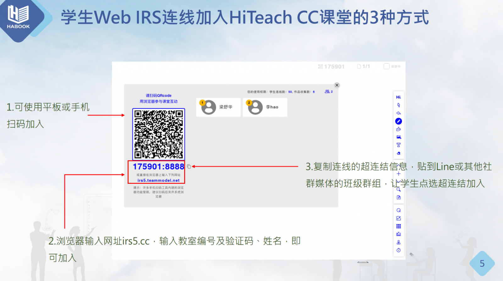 參與HiTeach CC互動的學員或?qū)W生有幾種連線的方式,包括用手機相機的掃碼功能、直接輸入網(wǎng)址與教室編號、或者使用實時生成的超連結(jié)網(wǎng)址等,讓參與者很容易就能夠加入講者的課程,并進行互動!