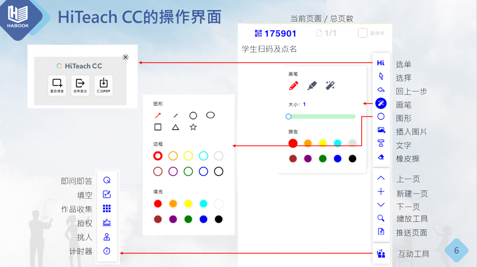 即使是匯入PDF檔的方式使用HiTeach CC,隨時都能夠使用簡單好用的畫板功能,包括筆觸/粗細/顏色、實心/空心圖形、插入圖片/文字、橡皮擦、頁面上下頁切換、縮放等,基本應用功能很齊全。