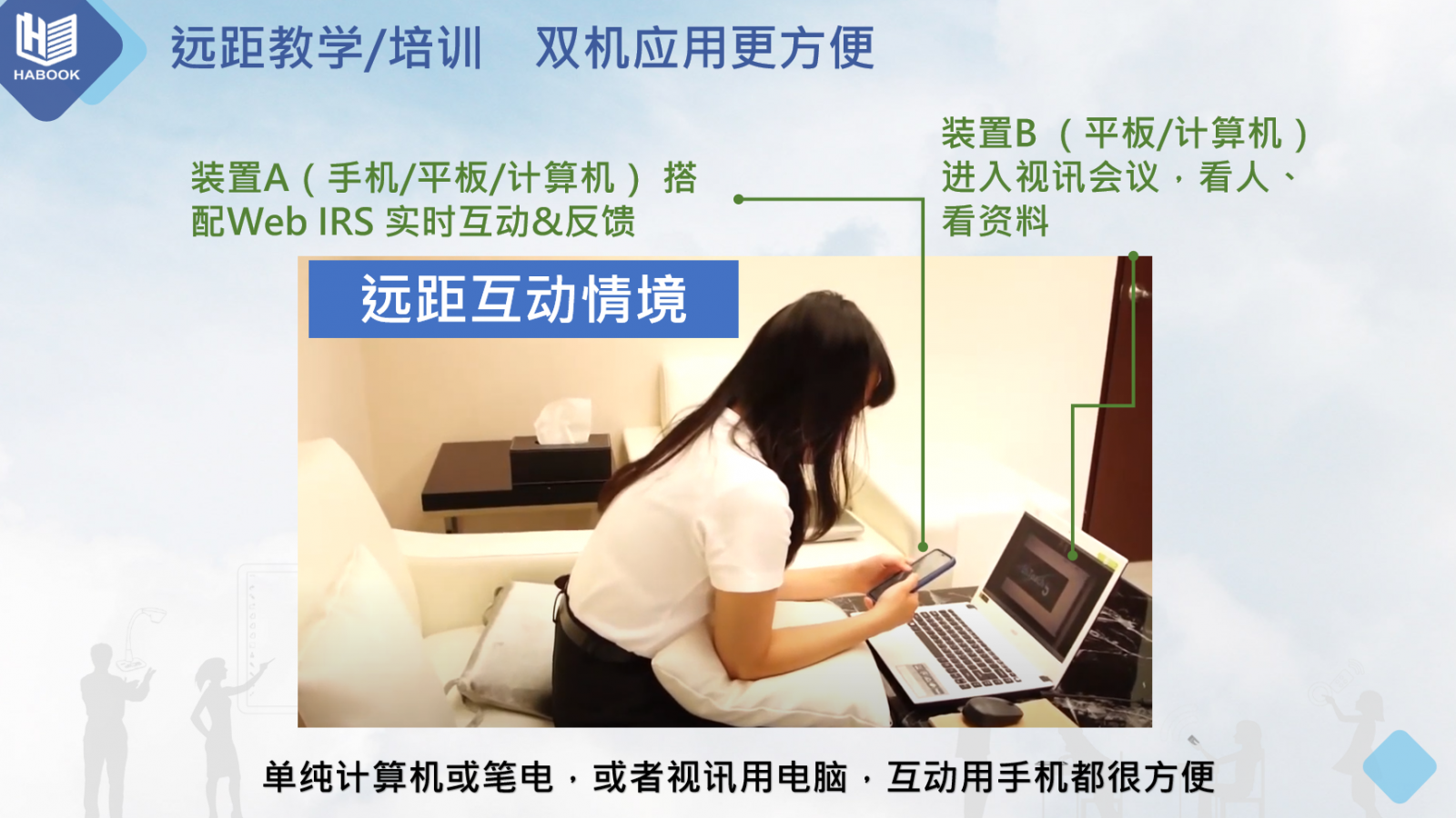 遠距教學應用時,配合視訊會議軟件的進行,學生或?qū)W員可以選擇自己適合的Web IRS互動連線方式。例如單純一臺計算機或筆電,則可用視訊會議軟件界面與瀏覽器界面切換的方式進行;假如學生有另一臺裝置(例如平板、手機),則可以用雙機進行,視訊會議畫面隨時觀看,另一臺裝置則用來使用Web IRS和教師互動與進行任務活動!