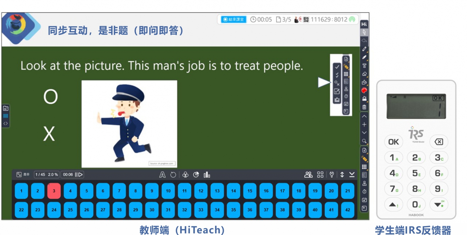 在IRS智慧教室中,學(xué)生不再只是被動式的舉手回答,通過HiTeach智慧教學(xué)系統(tǒng)的即問即答、搶權(quán)等功能,學(xué)生只要按下手中的IRS即時反饋器,就可以針對老師的問題回答,并且即時生成統(tǒng)計數(shù)據(jù),方便老師判斷學(xué)生學(xué)習(xí)情況,增進(jìn)教學(xué)效率。
