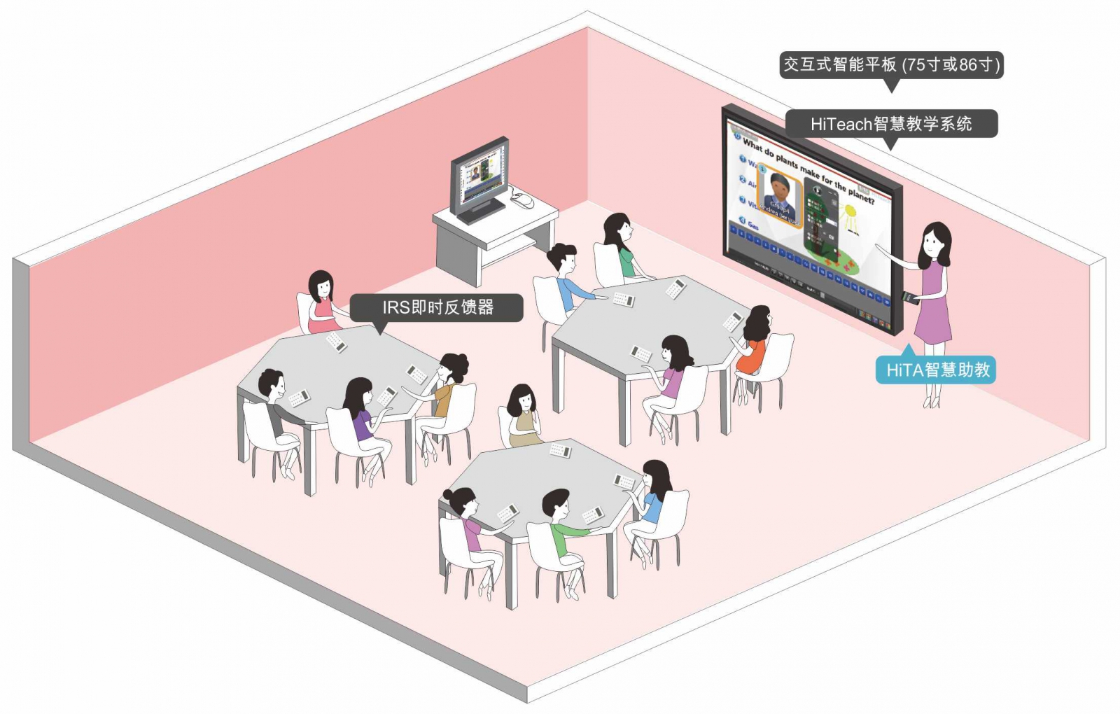 高效互動型課堂推薦 在IRS智慧教室中,學(xué)生不再只是被動式的舉手回答,透過HiTeach 5 專業(yè)版授權(quán)的即問即答、搶權(quán)、智慧挑人等功能,學(xué)生只要按下手中的IRS即時反饋裝置,就可以針對老師的問題回答,并且即時產(chǎn)生統(tǒng)計數(shù)據(jù);課堂小考也變簡單、價值更高了,老師容易判斷學(xué)生學(xué)習(xí)情況,學(xué)生課后更好復(fù)習(xí),增進(jìn)教與學(xué)的效益。這是學(xué)生端沒有平板電腦或其他計算機(jī)設(shè)備時,最簡便的應(yīng)用方案。