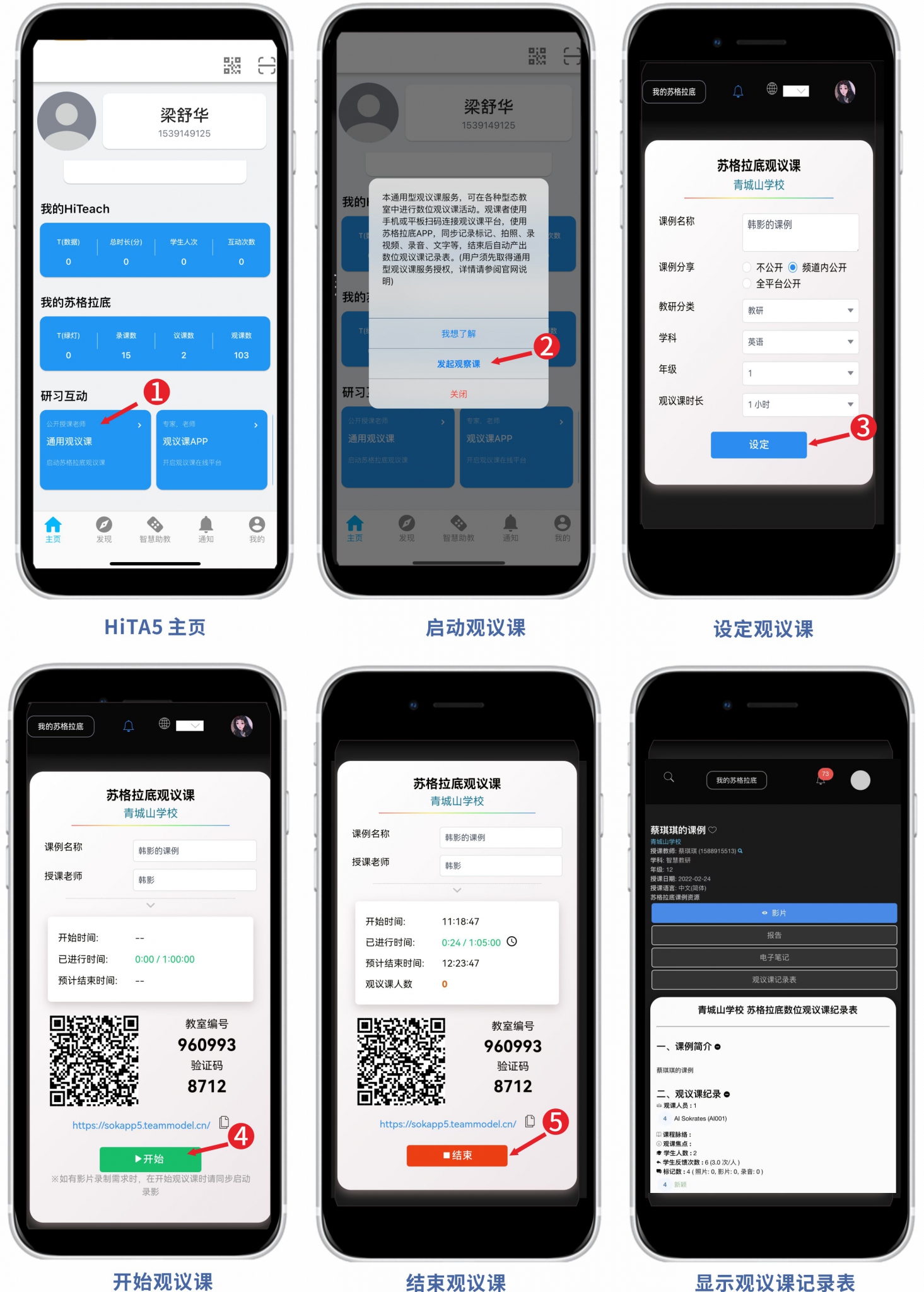 手機(jī)就能夠快速發(fā)起同步觀議課,突破專用數(shù)位觀議課教室限制,在原來班級(jí)教室或?qū)?平淌揖涂梢赃M(jìn)行數(shù)位觀議課。使用APP啟動(dòng)數(shù)位觀議課活動(dòng)后,就可開始自動(dòng)收集所有觀課者(或指導(dǎo)者)的觀課紀(jì)錄,包括文字、照片、錄音和錄像等觀議課標(biāo)記,觀課結(jié)束自動(dòng)輸出數(shù)位觀議課紀(jì)錄表。手機(jī)行動(dòng)同步觀議課操作功能畫面如下圖,使用HiTA 5醍摩豆教師APP,就能快速啟動(dòng)、設(shè)定、開始和結(jié)束數(shù)位觀議課。