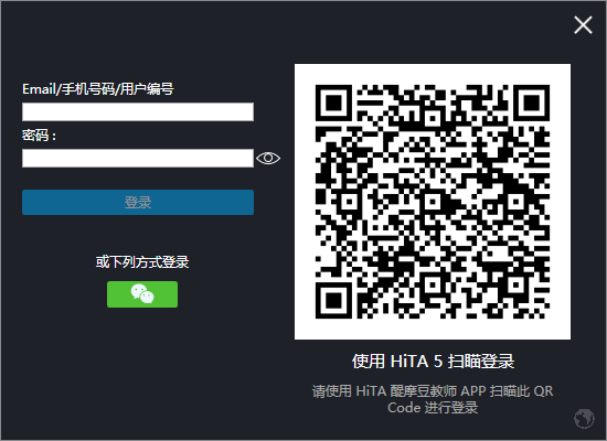 圖示,可執(zhí)行HiTeach助手。預設會彈出登入視窗,請使用HiTA app掃碼或賬號登入(用戶編號/google/facebook/wechat),登入后即可使用。