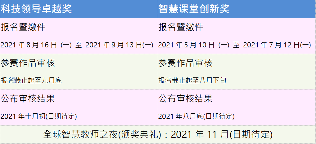 「科技領導卓越獎與智慧課堂創(chuàng)新獎」每年來自世界各地的智慧教師及學校校長人數(shù)多達百人以上,并于一年一度的智慧教育盛會,「全球科技領導與教學科技高峰論壇」之「全球智慧教師之夜」進行頒獎典禮,將給予得獎者最高肯定與表揚,是為教學科技相關盛大活動之一。