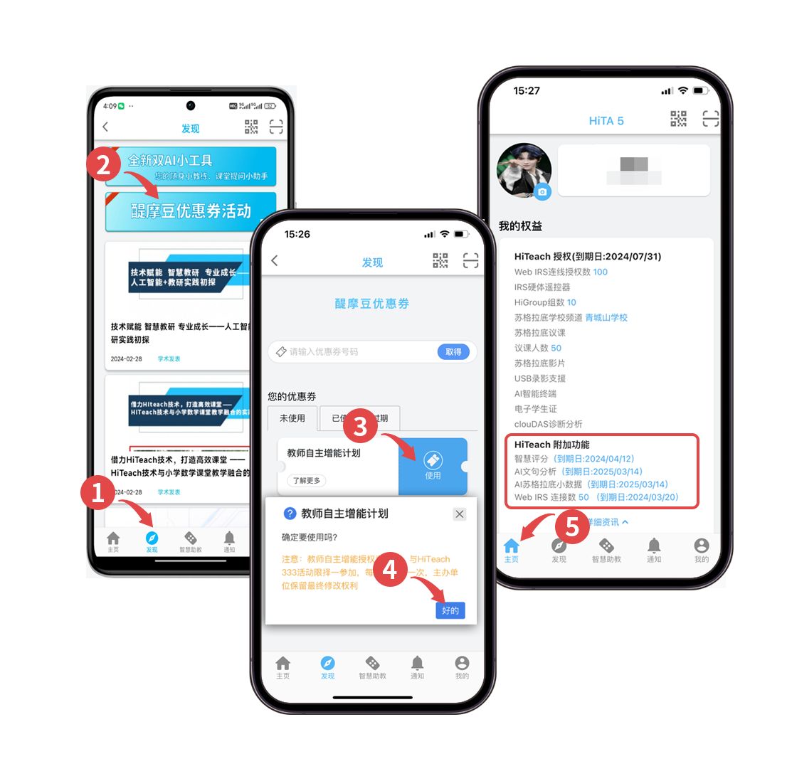 步驟三、在手機HiTA 5上申請教師自主增能計劃 到發(fā)現(xiàn)頁面點選醍摩豆優(yōu)惠卷活動,點選兌換鈕,因計劃一、計劃二僅能擇一參加,若您確定參加的是計劃一,則從提示畫面中點選兌換鈕,即可完成兌換。兌換成功后,到主頁的我的權益,點開詳細信息,即可看到您的個人權益已經(jīng)獲得HiTeach專業(yè)版50人連線授權 3個月。