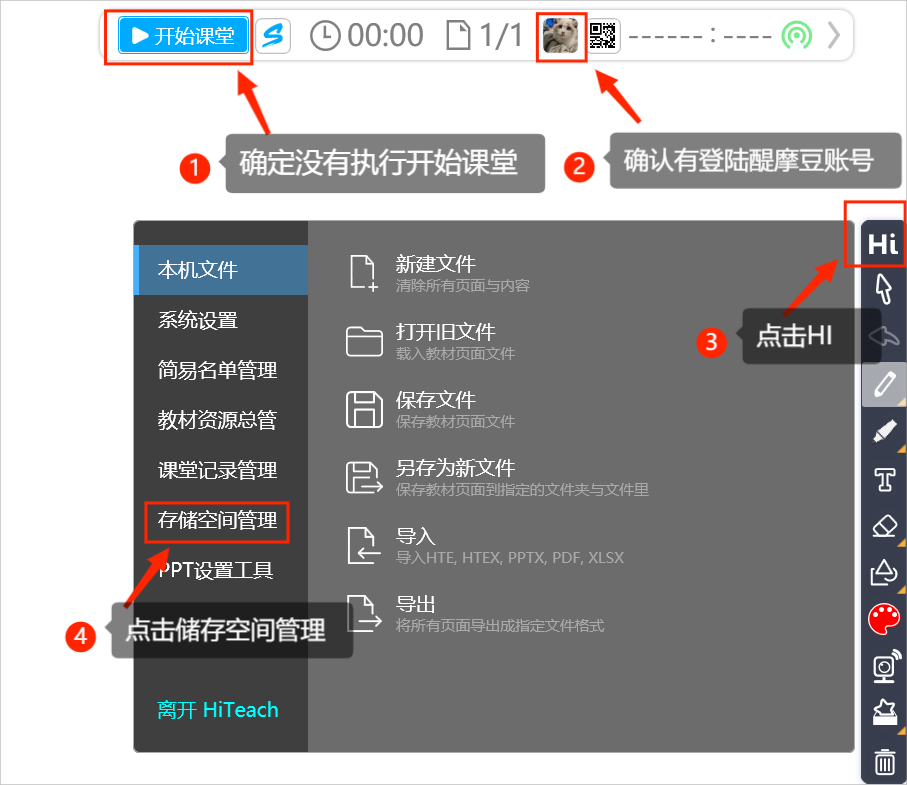 Step1:請(qǐng)先確定是在編輯模式下(也就是沒(méi)有執(zhí)行「開(kāi)始課堂」),再點(diǎn)選Hi鈕,出現(xiàn)選單后,點(diǎn)選儲(chǔ)存空間管理。