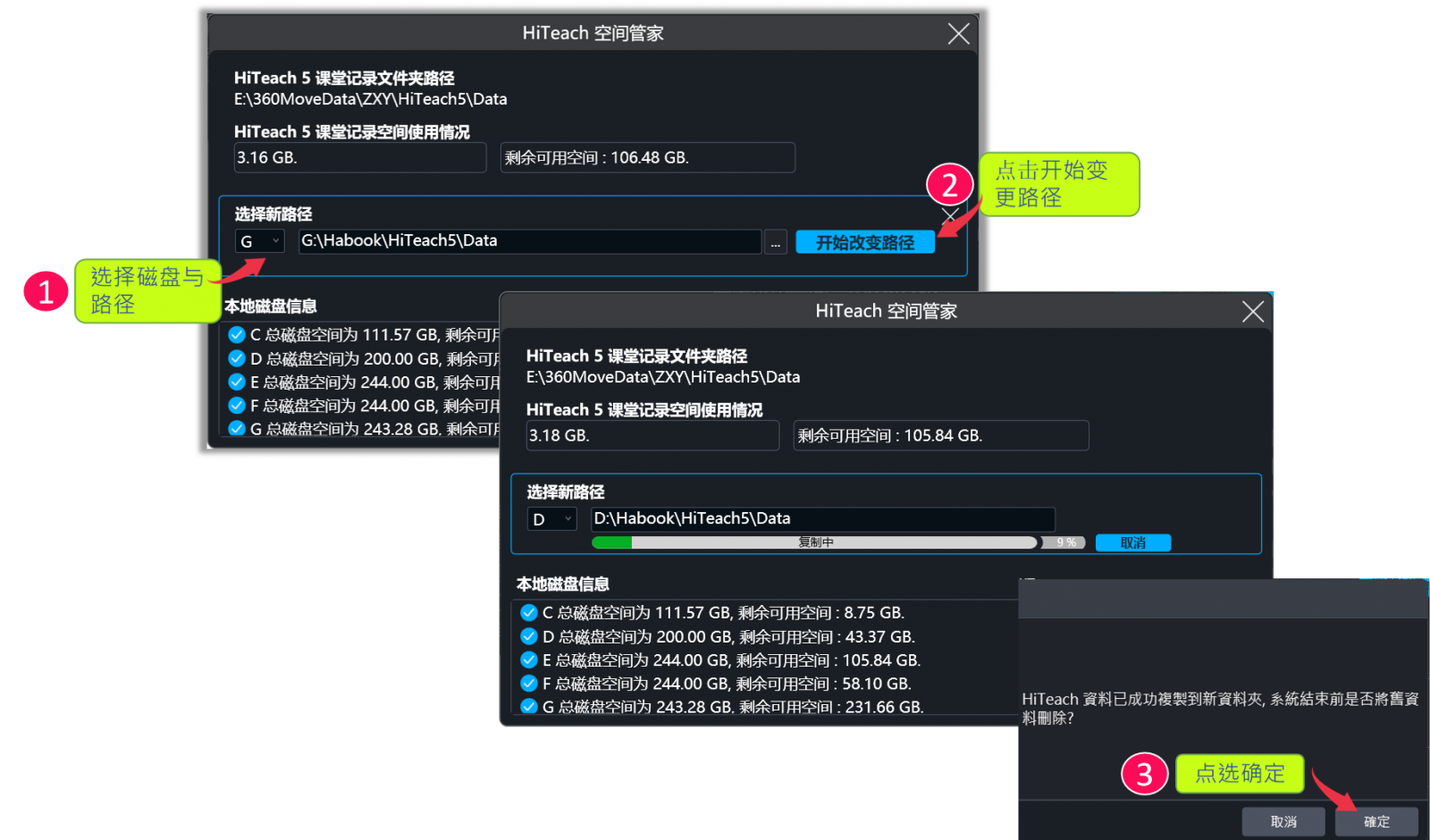 Step3:選擇預(yù)計(jì)變更的硬盤(pán)以及新資料夾后,點(diǎn)選開(kāi)始變更路徑鈕,隨即開(kāi)始進(jìn)行檔案復(fù)制遷移的動(dòng)作,完成后,若確定要?jiǎng)h除原資料夾的內(nèi)容,則點(diǎn)選確定鈕。