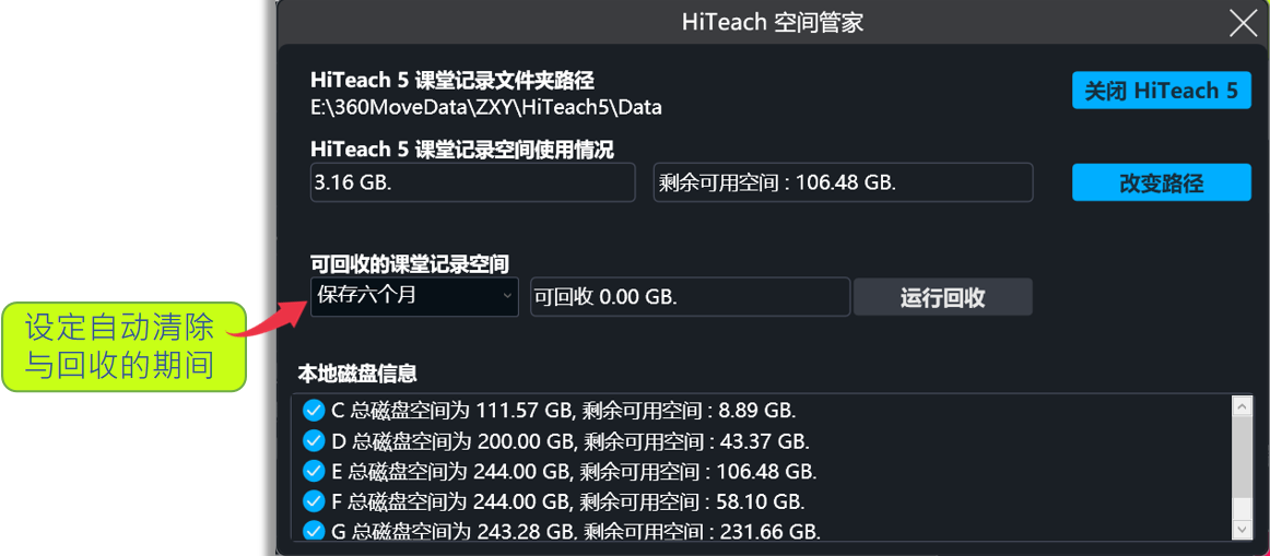 隨著課堂應(yīng)用的頻率增加,課堂歷程記錄也會(huì)占用計(jì)算機(jī)的儲(chǔ)存空間,若有發(fā)生硬盤(pán)空間不足的情況,HiTeach提供您重新設(shè)定新的硬盤(pán)紀(jì)錄儲(chǔ)存路徑,并將已經(jīng)存在的紀(jì)錄復(fù)制到新路徑,即可將原路徑的資料刪除,把儲(chǔ)存空間釋放出來(lái)。重新設(shè)定HiTeach課堂紀(jì)錄儲(chǔ)存路徑的操作步驟如下: