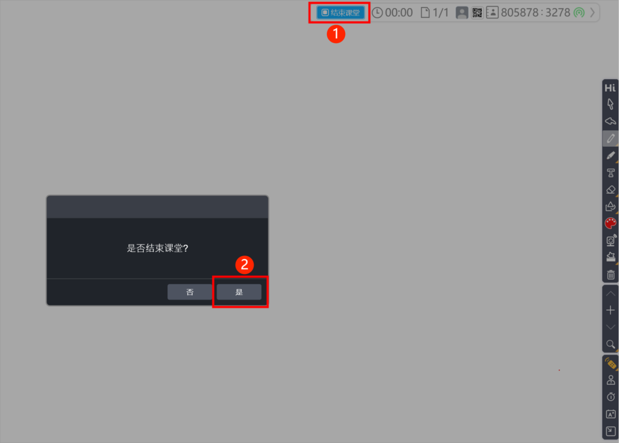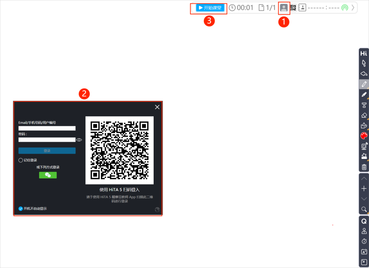 步驟2.結(jié)束課堂之后,請您使用HiTA 5 掃碼或輸入帳密的方式登入您的賬號后,再重新執(zhí)行 "開始課堂" 。