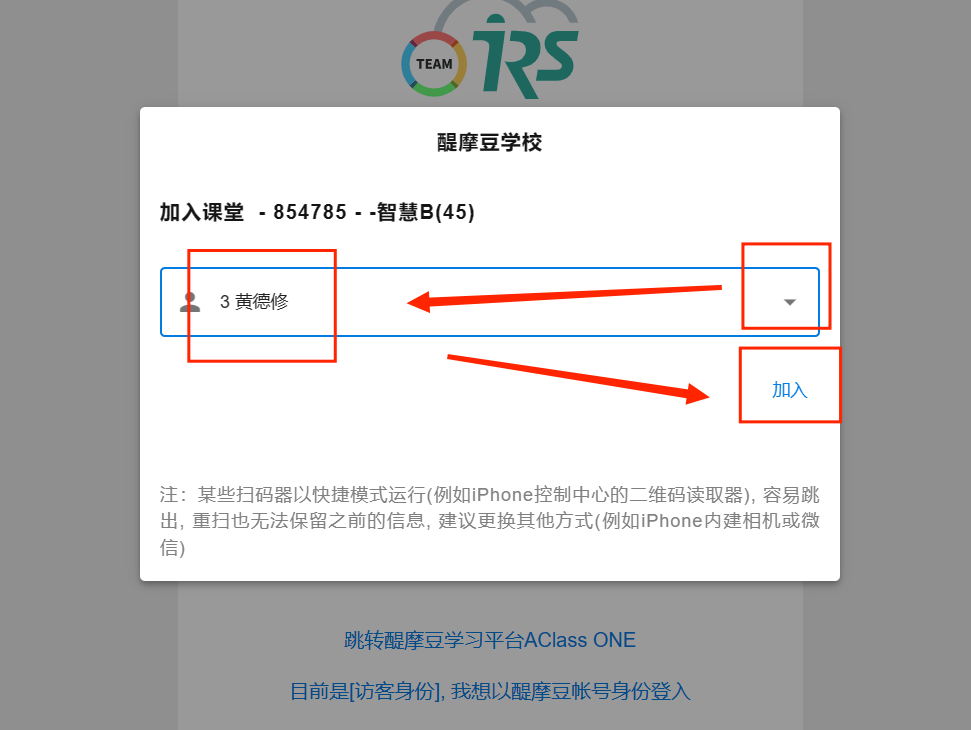步驟2.學(xué)生端請使用行動載具開啟 QRCode APP 直接掃碼連線,再選擇自己的名字后選擇加入即可連線。