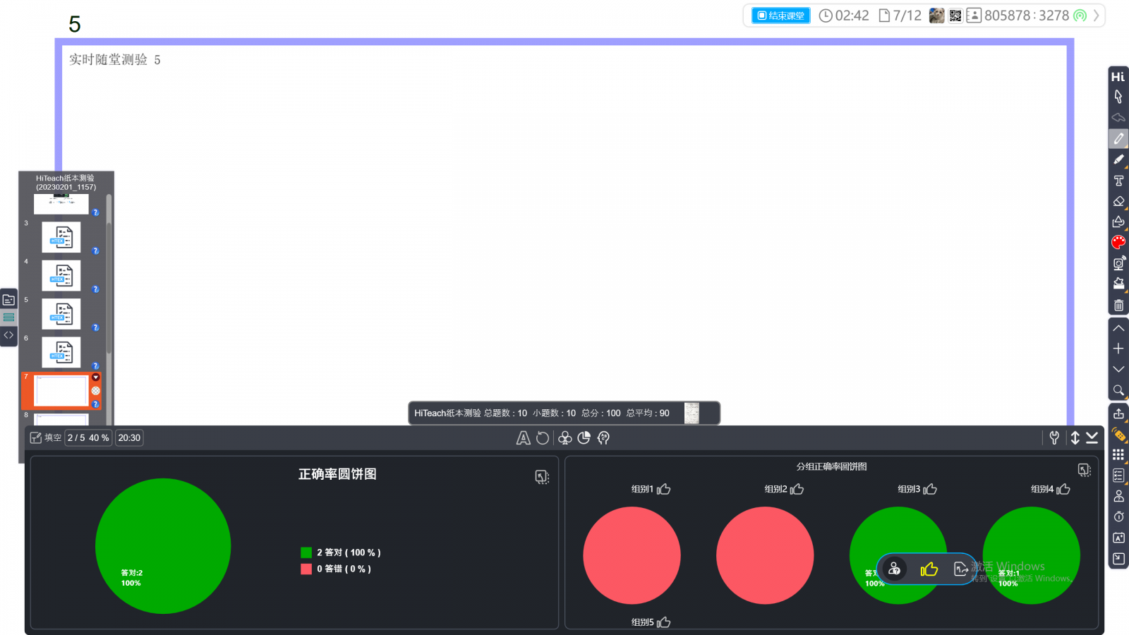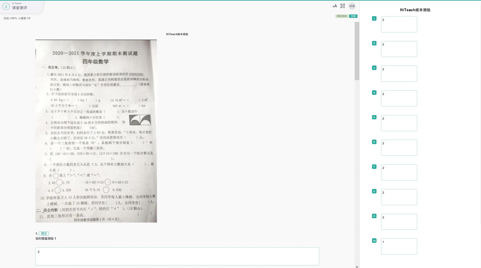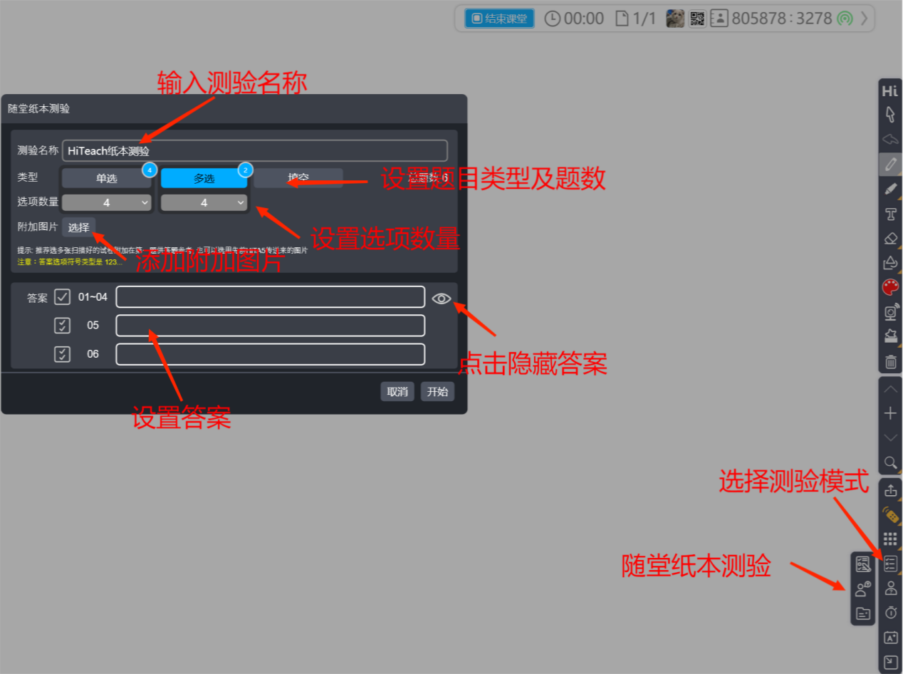 學生答完試卷后或開始測驗的過程中,老師就可以啟動HiTeach的隨堂紙本測驗模式。在隨堂紙本測驗視窗中,設定試卷題型與題數(shù)、選項數(shù),例如單選題X5、復選題X3和填充題X2,如果有準備這份試卷的圖片,或者臨時拍照的試卷圖,可以做為附件(學生端Web IRS就會看到試卷圖片、測驗結(jié)束評講時也可作為講解說明),接著設定答案時,可以選擇隱藏鈕,避免學生看見正確答案,完成設定后,在HiTeach的畫面上會顯示每一個學生的答題進度。
