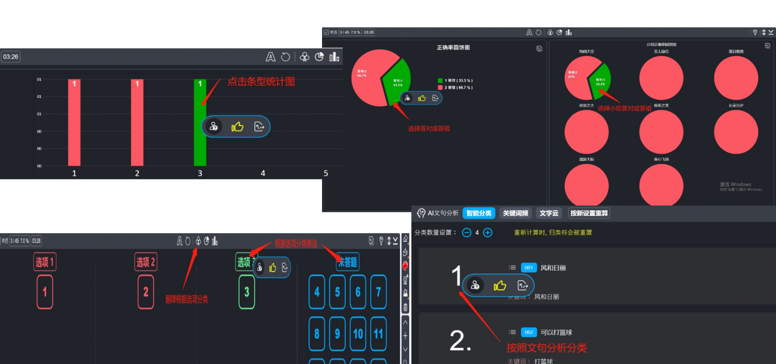 在使用HiTeach進(jìn)行教學(xué)時(shí),最常使用的功能之一就是各項(xiàng)互動(dòng)或測(cè)驗(yàn)功能,例如選擇題、是非題、填充題/文字題,當(dāng)學(xué)生端使用Web IRS或IRS反饋器進(jìn)行反饋之后,最精彩的就是實(shí)時(shí)顯示統(tǒng)計(jì)圖表,進(jìn)行數(shù)據(jù)決策后的教學(xué)活動(dòng)。根據(jù)數(shù)據(jù)統(tǒng)計(jì)的結(jié)果,即可啟動(dòng)智慧挑人、加分或差異化推送的功能。
