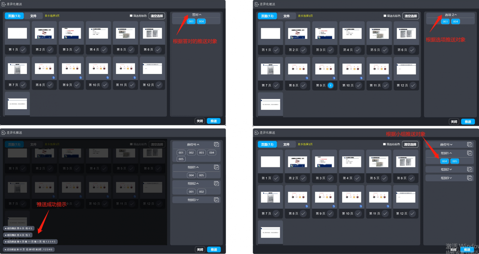 除了根據(jù)互動(dòng)數(shù)據(jù)結(jié)果之外,也可以手動(dòng)推送,來源可以是頁面或檔案,推送對(duì)象則可以是全班、小組或個(gè)人。