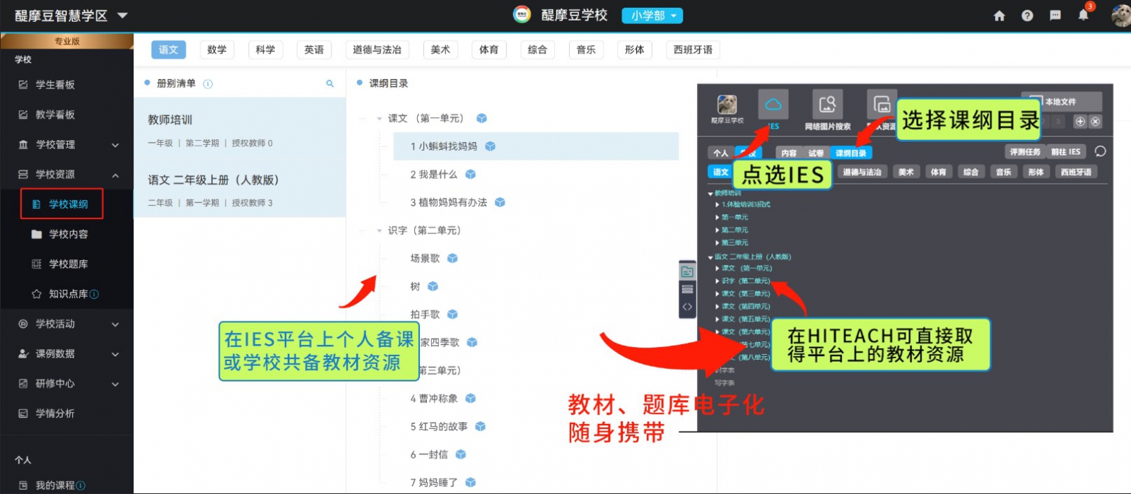 在課堂上使用HiTeach進(jìn)行智慧教學(xué)時,HiTeach的教材資源區(qū)可顯示IES 5平臺上的課綱目錄資源,以樹狀展開個人與學(xué)校課綱,教材可另存、匯入,并可依情境開啟或進(jìn)行測驗(yàn),備課教材的取用更加便利。
