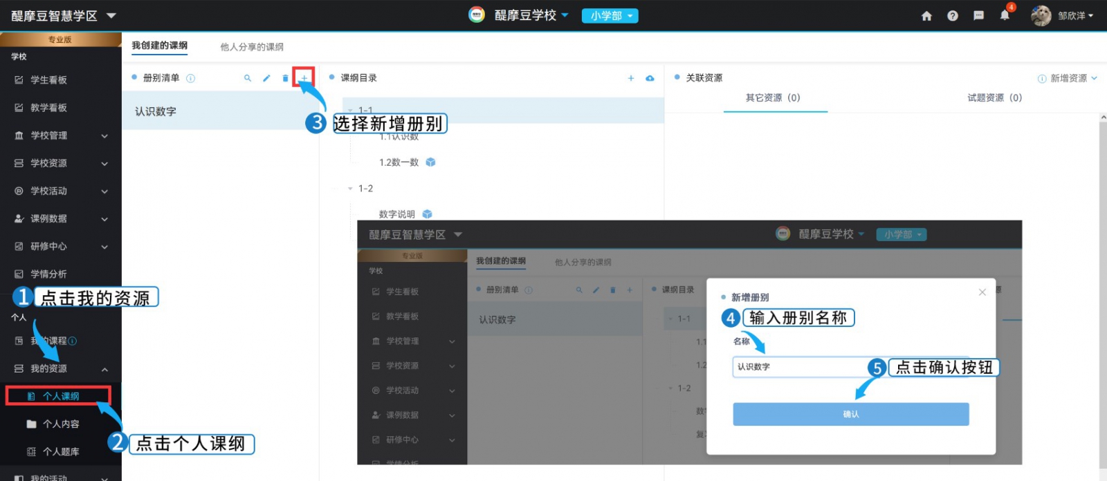 Step1:登入IES,點(diǎn)選我的資源/個人課綱,接著點(diǎn)選+新增冊別圖示,彈出新增冊別視窗后,輸入冊別名稱,然后點(diǎn)選確認(rèn)鈕。