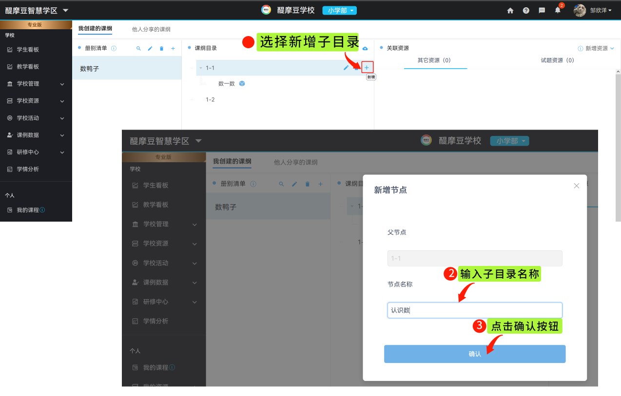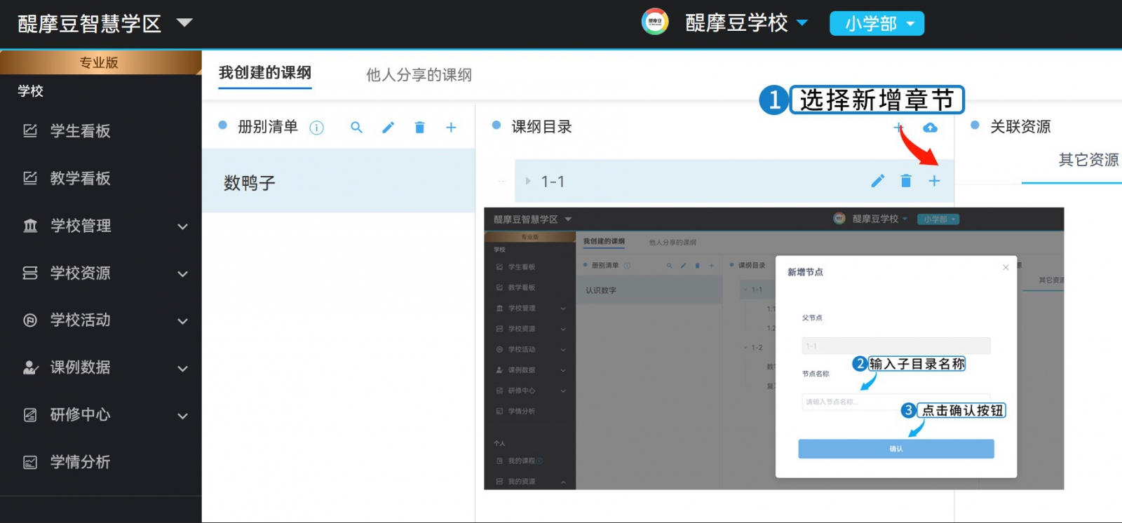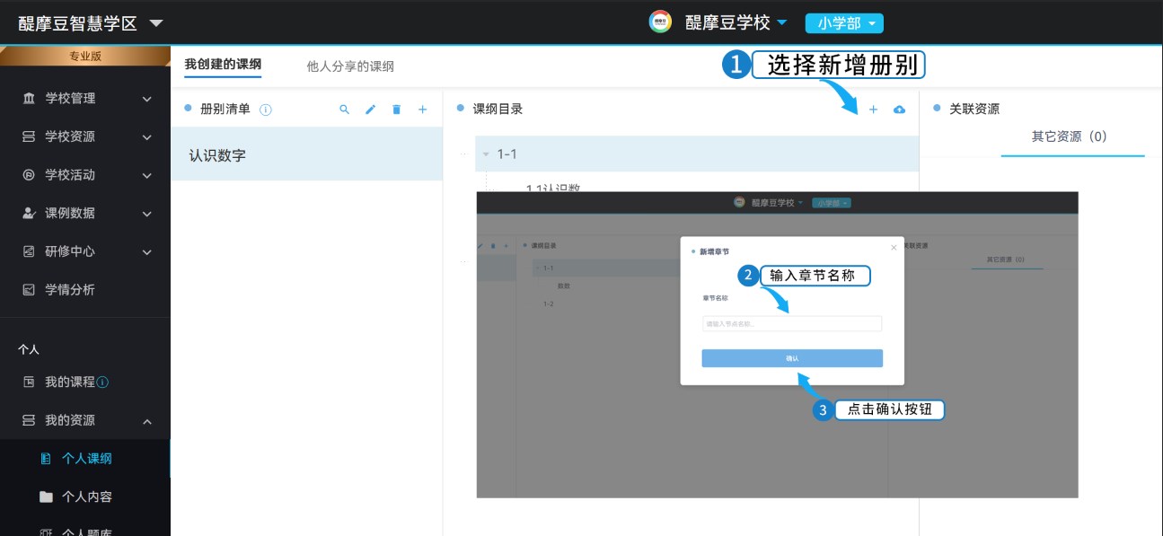 IES平臺的課綱目錄是以冊別、章節(jié)方式編排,每個章節(jié)可以下分到3級,便于依據(jù)單元做內(nèi)容資源安排。建立個人課綱的操作方法如下: