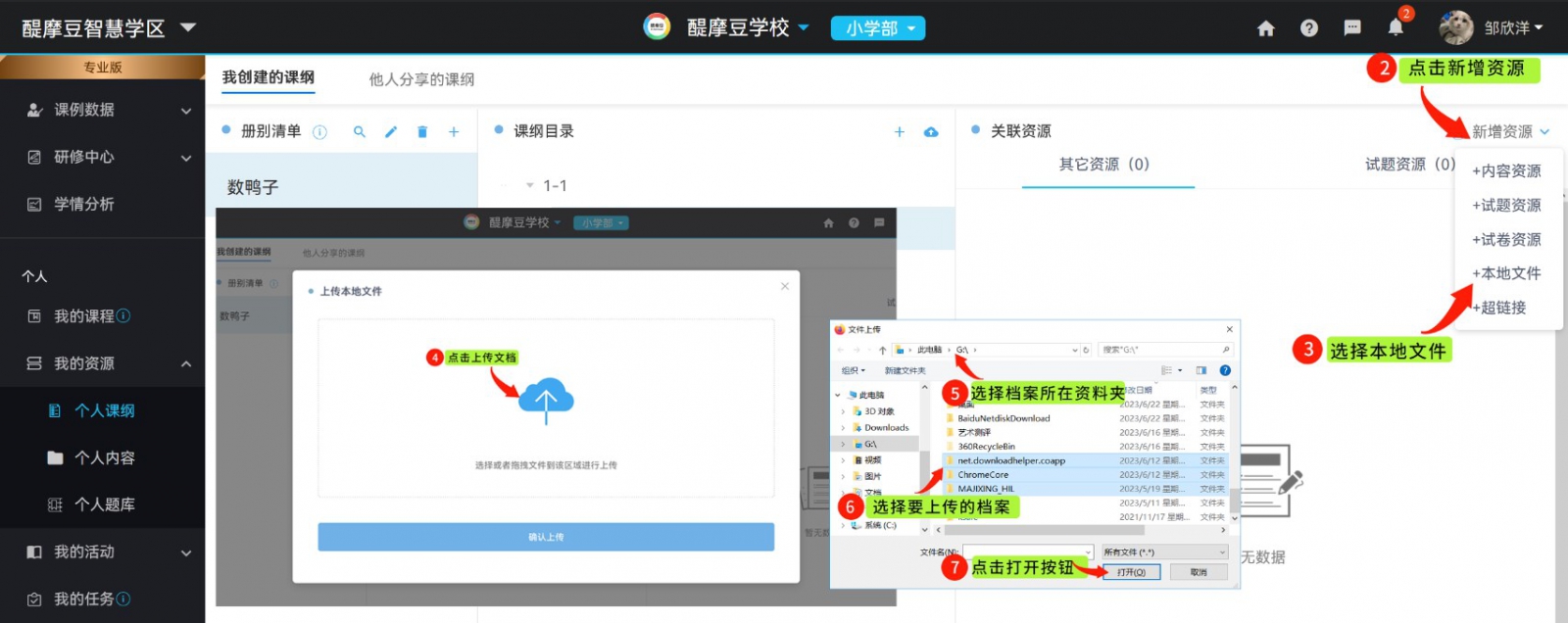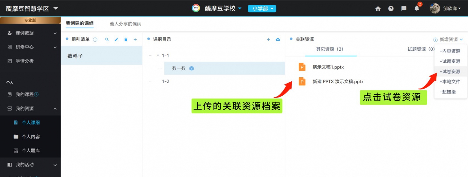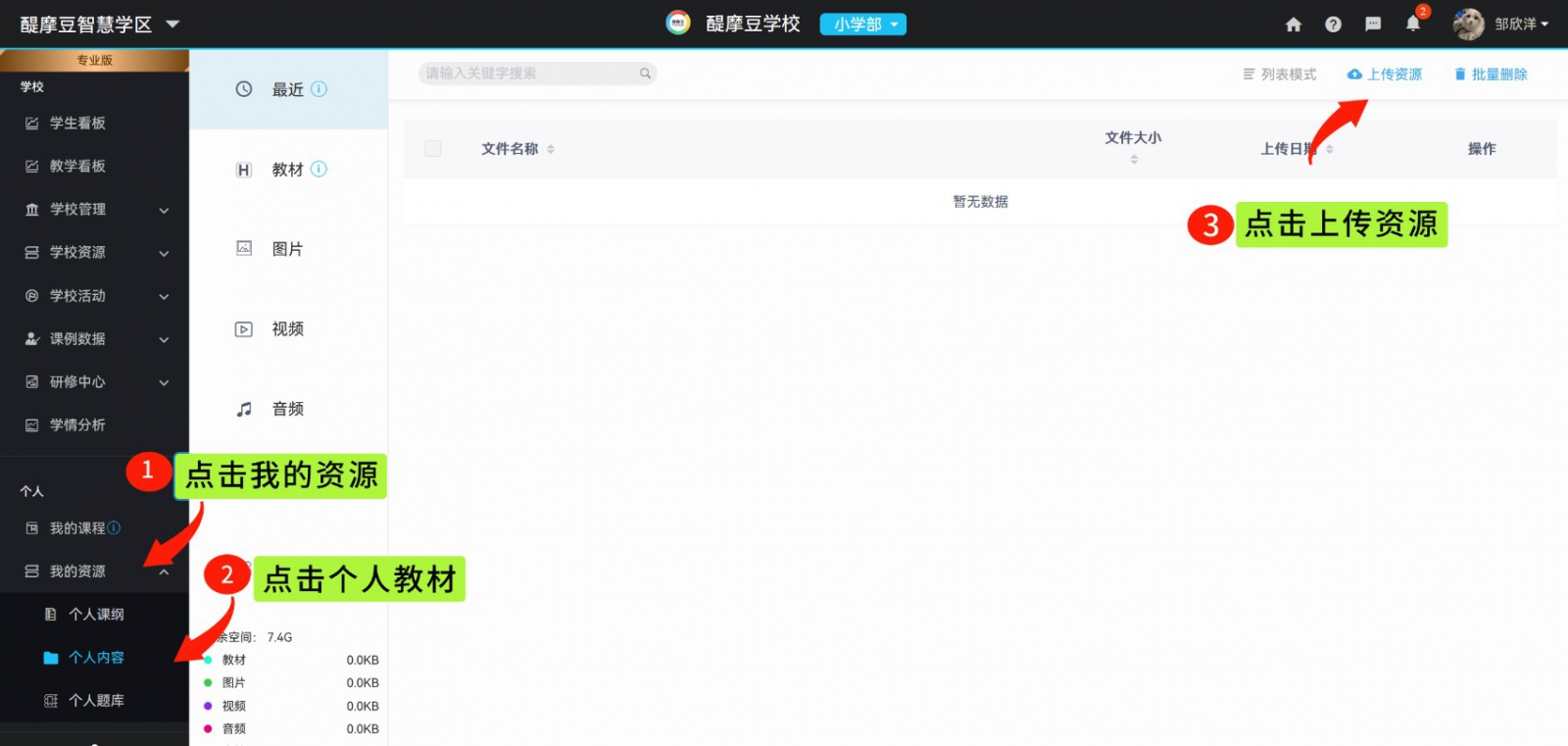Step1:選擇我的資源/個人教材,接著點(diǎn)選上傳資源。