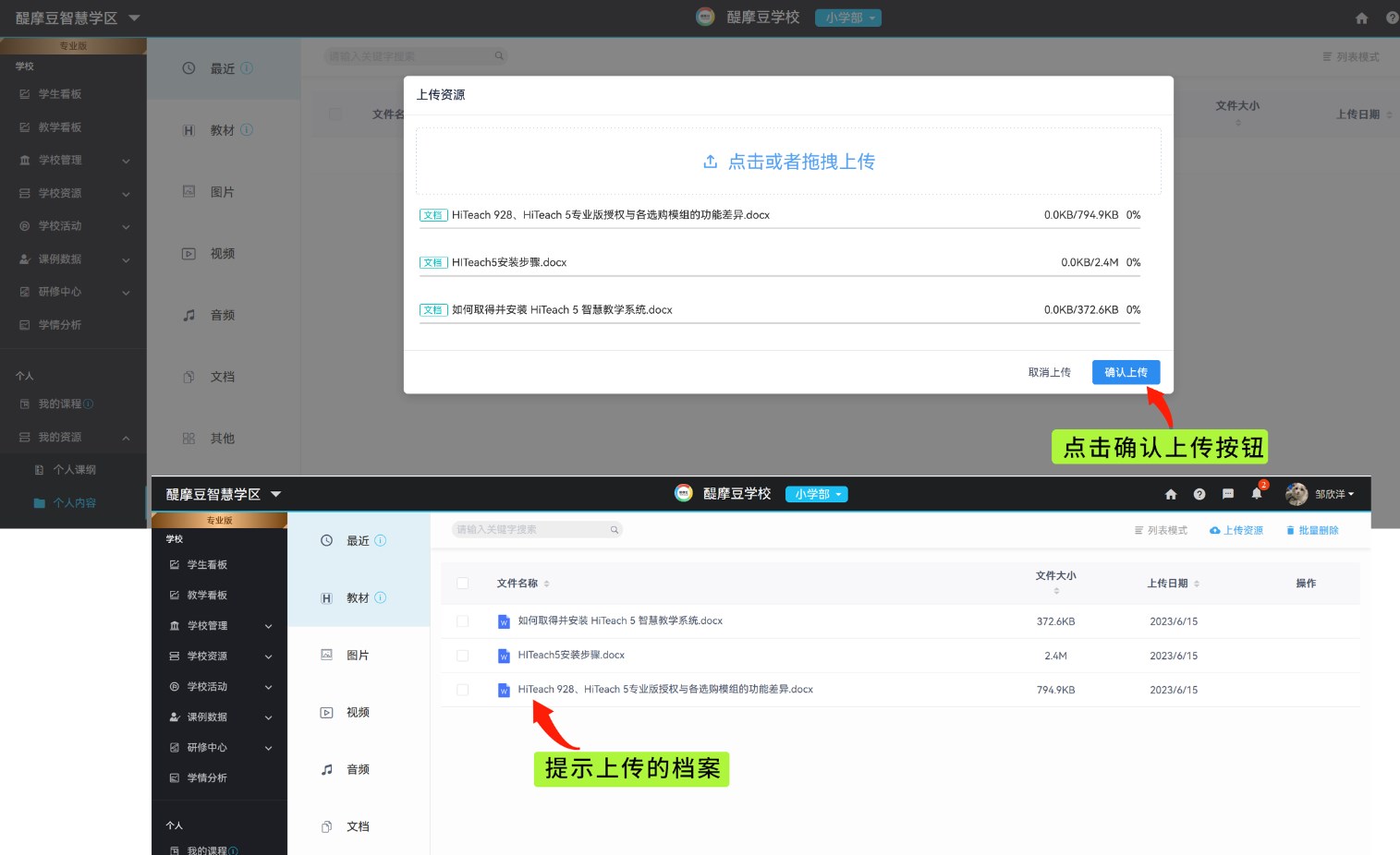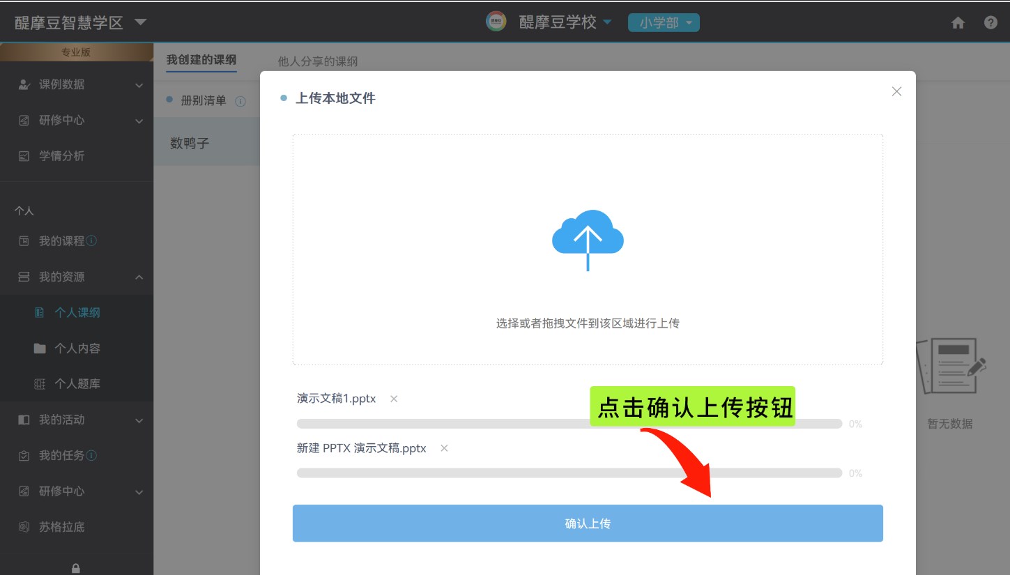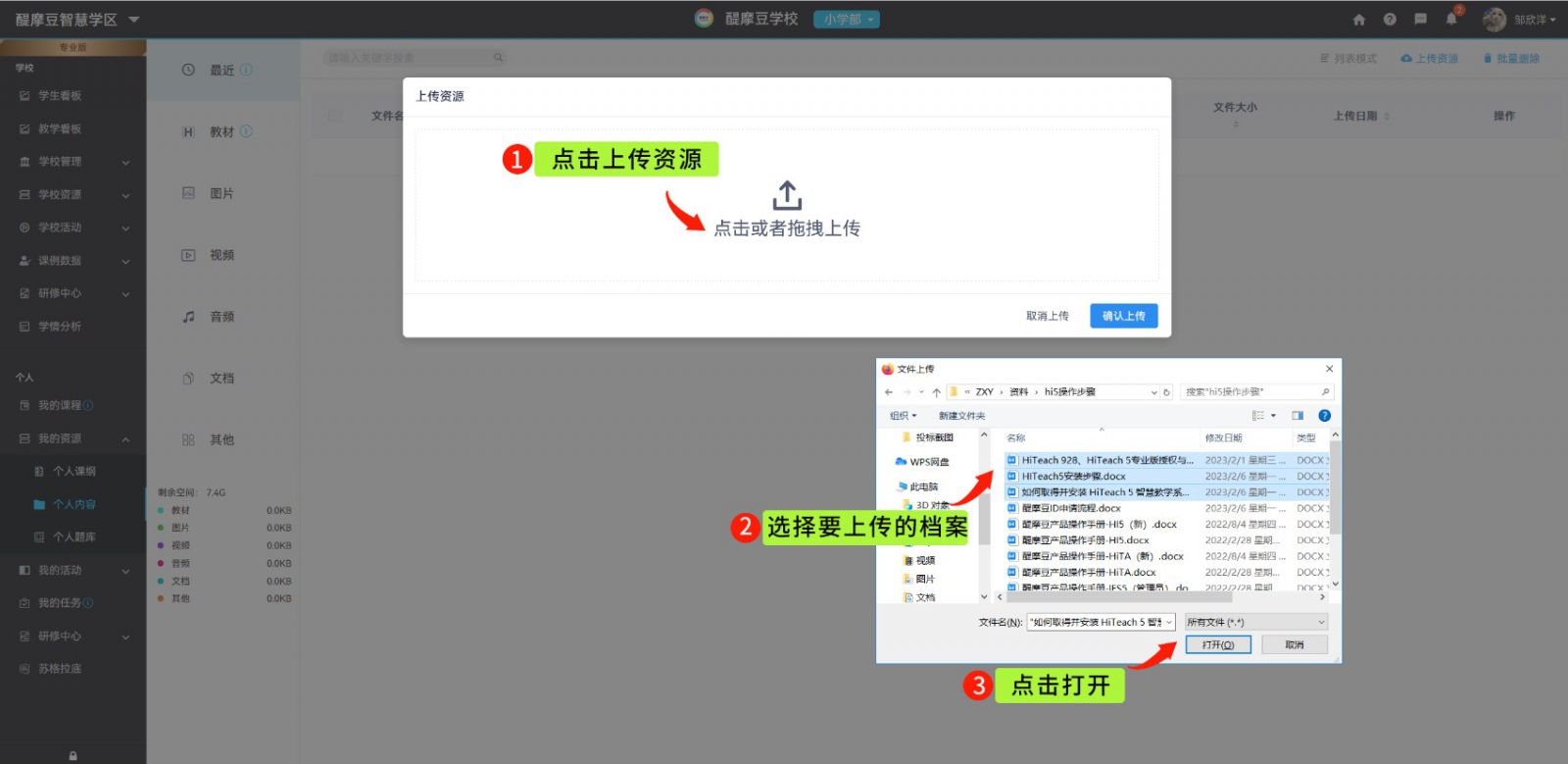 Step1:選擇我的資源/個人教材,接著點(diǎn)選上傳資源。