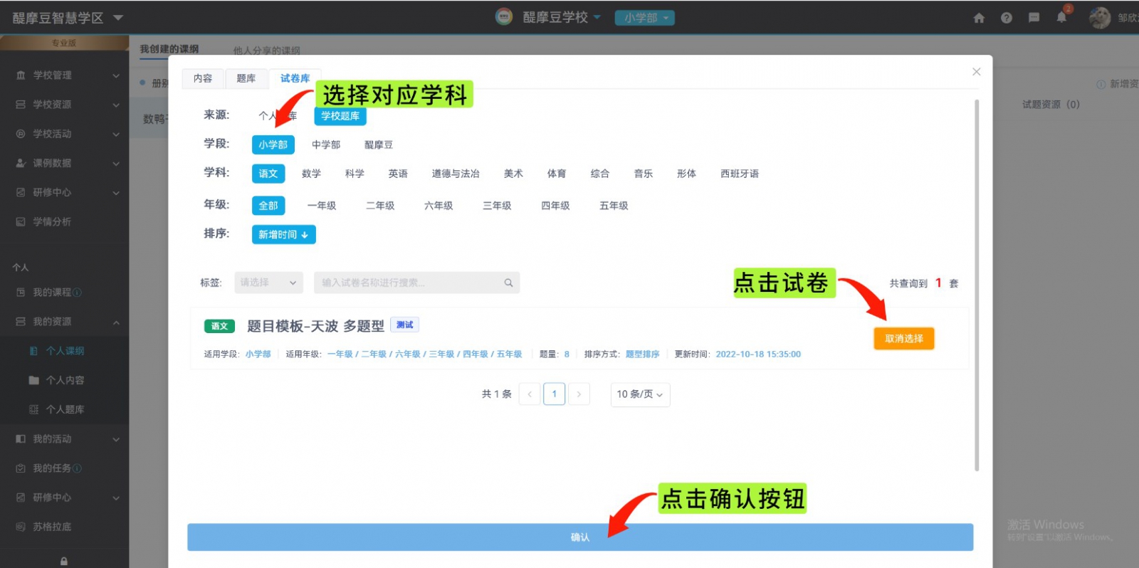 檔案傳送完成后,就會在關(guān)聯(lián)資源區(qū)顯示。假如IES上已經(jīng)建立了試題、試卷資源(相關(guān)信息請參考:素養(yǎng)導(dǎo)向云平臺題庫與試卷應(yīng)用,以及Word試卷匯入IES快速建立在線試卷),若要安排這個單元的隨堂小考,則可同上述Step4的選單中,點(diǎn)選+試卷資源,接著選擇試卷所在位置,在想要取用的試卷右側(cè)點(diǎn)選選擇試卷鈕,然后點(diǎn)選確認(rèn)鈕。