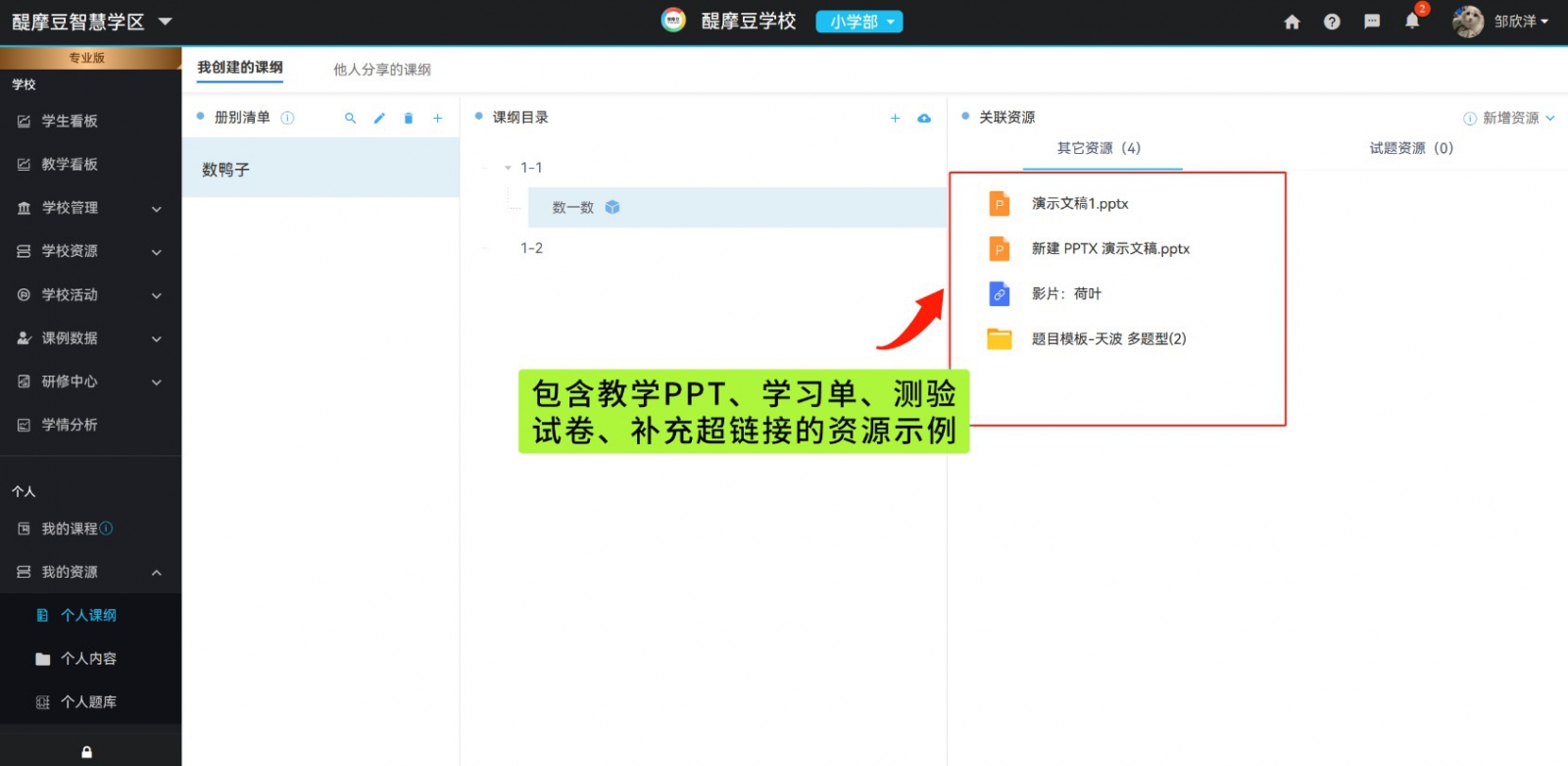 醍摩豆云平臺IES之課綱目錄功能的全稱是結(jié)構(gòu)化課綱目錄,是提供使用者以結(jié)構(gòu)化、編序方式安排課程教材和試卷的共同備課平臺,包含教師個人應(yīng)用的「個人課綱」和學(xué)校層級共同使用的「學(xué)校課綱」功能,幫助學(xué)校老師們進(jìn)行云端備課,將教學(xué)所需的教材(PowerPoint、HTEX、PDF、圖片、影片、網(wǎng)頁超連結(jié)等)、試卷(試題)安排到課綱目錄中。