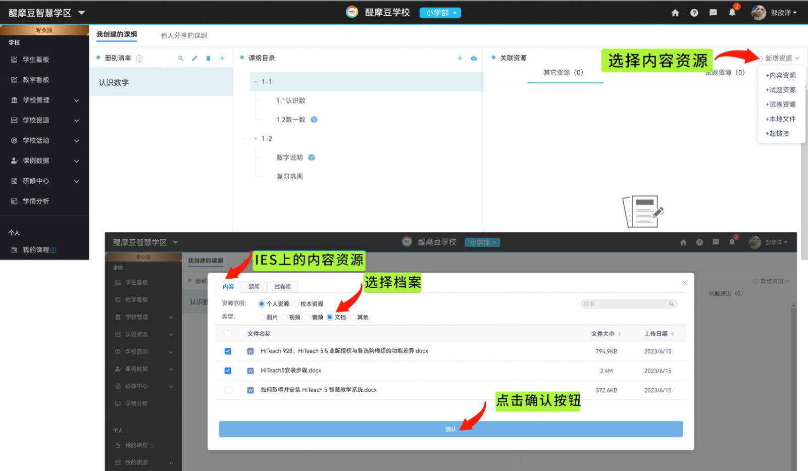 前述Step4新增關(guān)聯(lián)資源的操作中,除了本機(jī)檔案的教材來源之外,也可以選擇已經(jīng)保存在IES上的內(nèi)容資源。內(nèi)容資源是指之前已經(jīng)上傳到IES我的資源/個人教材的檔案、圖片、多媒體內(nèi)容等,簡單介紹如下: