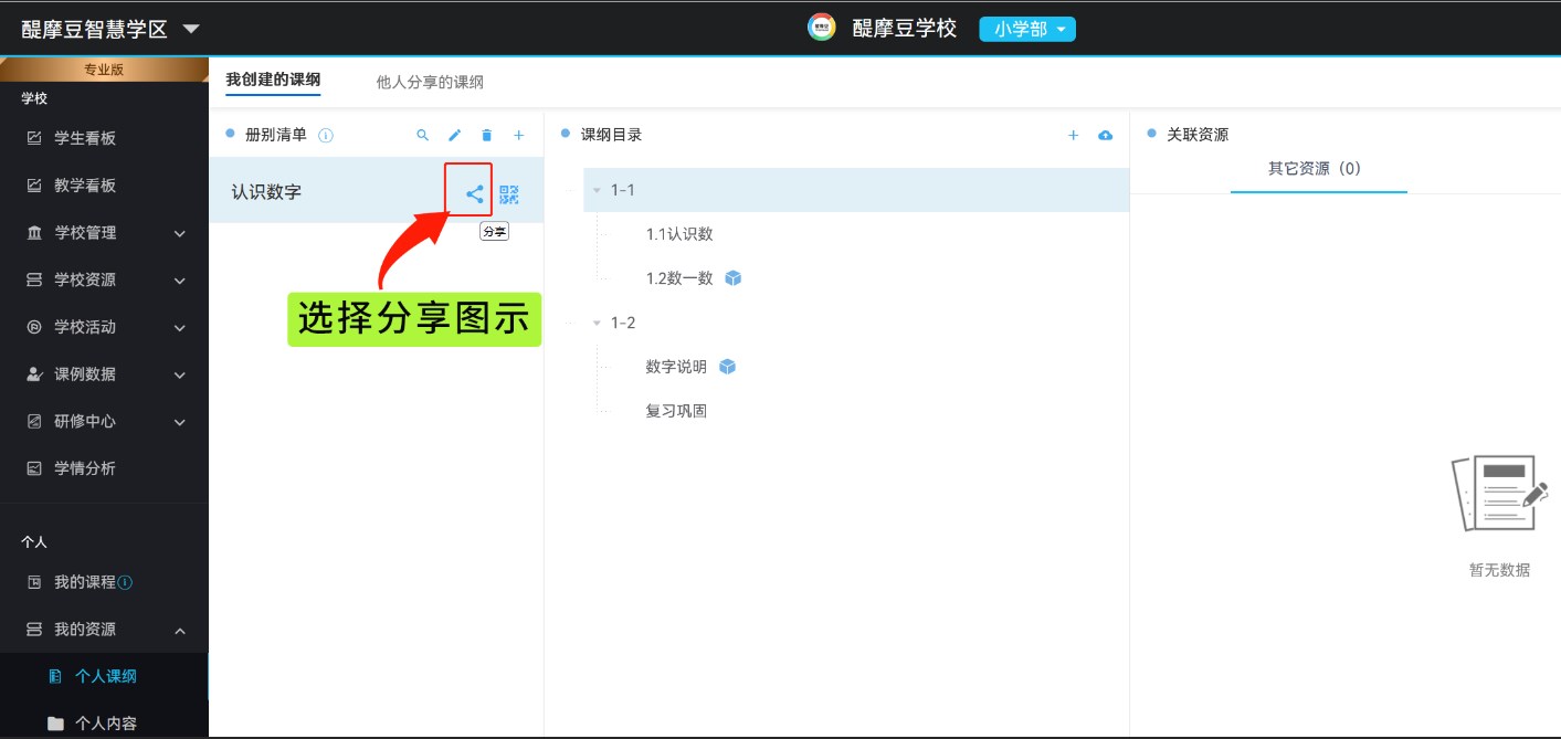 個人建立完成的課綱可以透過分享的功能,讓其他老師共享使用。分享的方式是移動鼠標(biāo)指標(biāo)到預(yù)計分享的課綱冊別上,點(diǎn)選分享圖示。