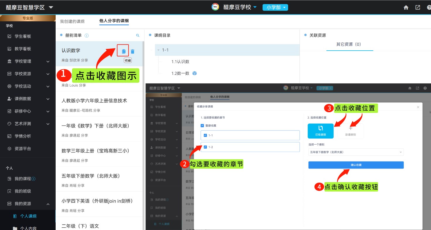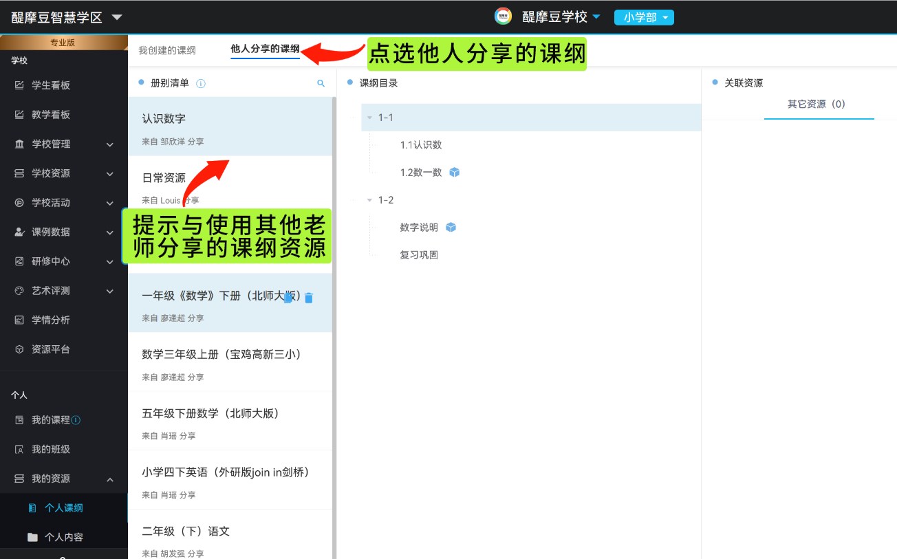 取得分享資源的老師,登入自己的IES賬號后,在自己的個人課綱部分,選擇他人分享的課綱標(biāo)簽,就會看到課綱目錄的內(nèi)容。