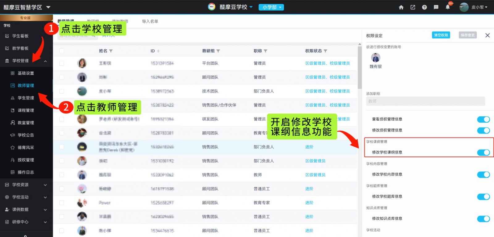 IES學(xué)校成員如何取得學(xué)校課綱的管理與編輯權(quán)限?學(xué)校課綱的完整管理功能,包括冊別新增、編輯、刪除、設(shè)定參與共編老師等,必須是IES系統(tǒng)管理員所設(shè)定具有學(xué)校課綱管理權(quán)限的老師,通常是學(xué)校行政管理人員、教務(wù)管理人員、社群管理者等角色才會有相關(guān)權(quán)限。請學(xué)校有IES系統(tǒng)管理員權(quán)限的老師,在IES點(diǎn)選學(xué)校管理/教師管理,然后在預(yù)計設(shè)定管理權(quán)限的老師賬號最右側(cè),點(diǎn)選設(shè)定權(quán)限的圖示,展開功能設(shè)定畫面后,點(diǎn)選開啟修改學(xué)校課綱信息功能。