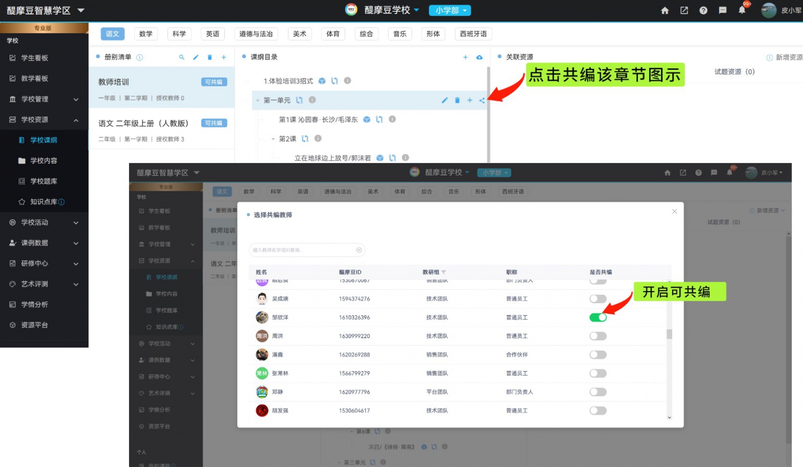 除了整冊共編之外,IES也允許依章節(jié)方式來設(shè)定共編,讓團(tuán)隊成員可更明確地針對各自負(fù)責(zé)的章節(jié)分工,為自己可共編的章節(jié)執(zhí)行新增小節(jié)、編輯、刪除、新增資源等功能的操作。具備有學(xué)校課綱管理權(quán)限的老師,在欲分享的章節(jié)處點(diǎn)選共編該章節(jié)圖示,出現(xiàn)選擇共編教師的畫面后,針對要開放編輯功能的老師,開啟共編功能,確定都設(shè)定完成后,點(diǎn)選關(guān)閉鈕關(guān)閉視窗。