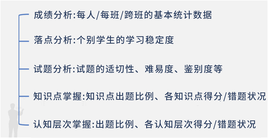 自動產(chǎn)出學(xué)習(xí)評量數(shù)據(jù)之后,經(jīng)由clouDAS診斷分析服務(wù),可以在IES上查看成績分析、學(xué)習(xí)落點(diǎn)分析、知識點(diǎn)掌握和認(rèn)知層次掌握等學(xué)習(xí)分析、試題分析報(bào)告,分析班級與個(gè)別學(xué)生的學(xué)習(xí)情況。