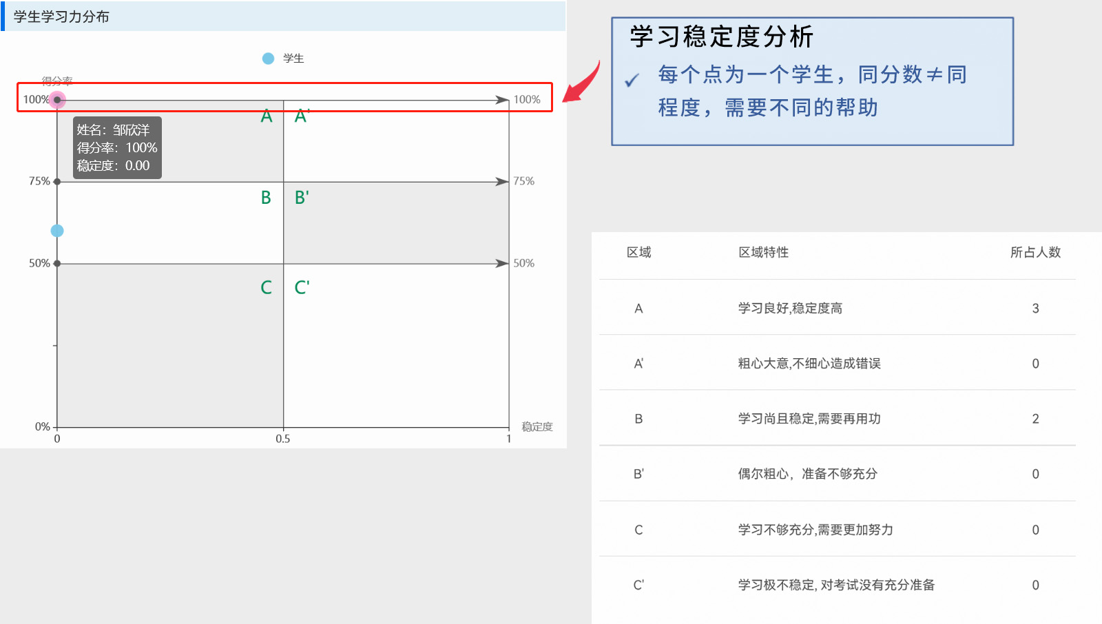 學(xué)生學(xué)習(xí)力落點(diǎn)分布圖分為六個(gè)區(qū)塊,分別是A、A'、B、B'、C、C'等六區(qū),每個(gè)區(qū)塊所代表的意義不同,例如落在A區(qū)的學(xué)生,代表學(xué)習(xí)良好穩(wěn)定度高,落在A'區(qū)的學(xué)生,代表粗心大意不細(xì)心造成錯(cuò)誤。