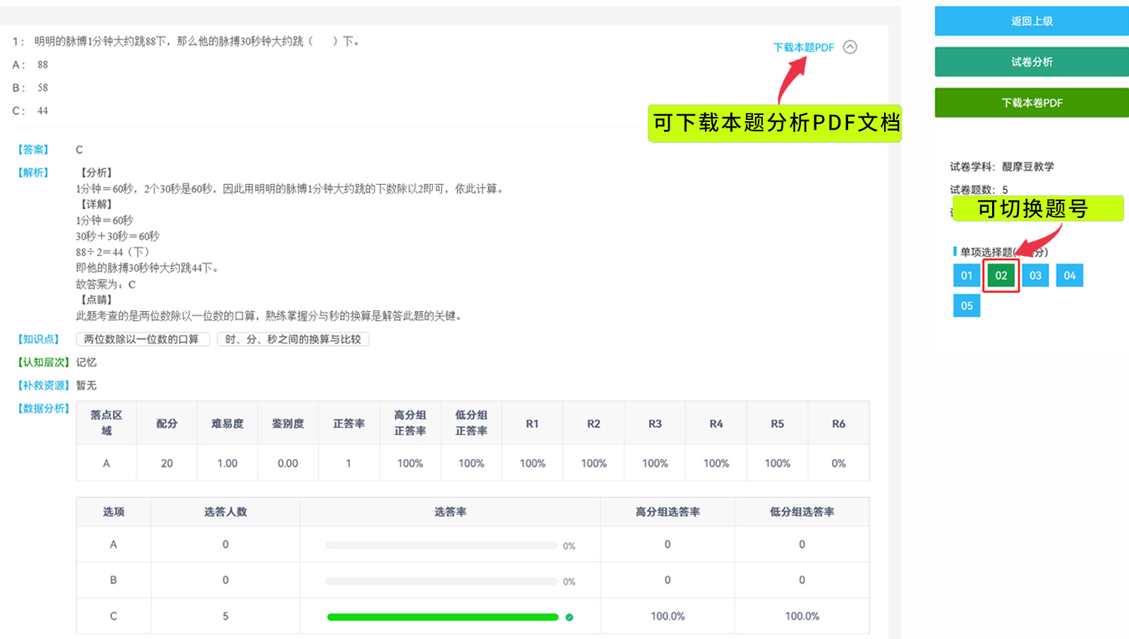 可查看單題作答資料分析、或下載該題分析PDF檔
