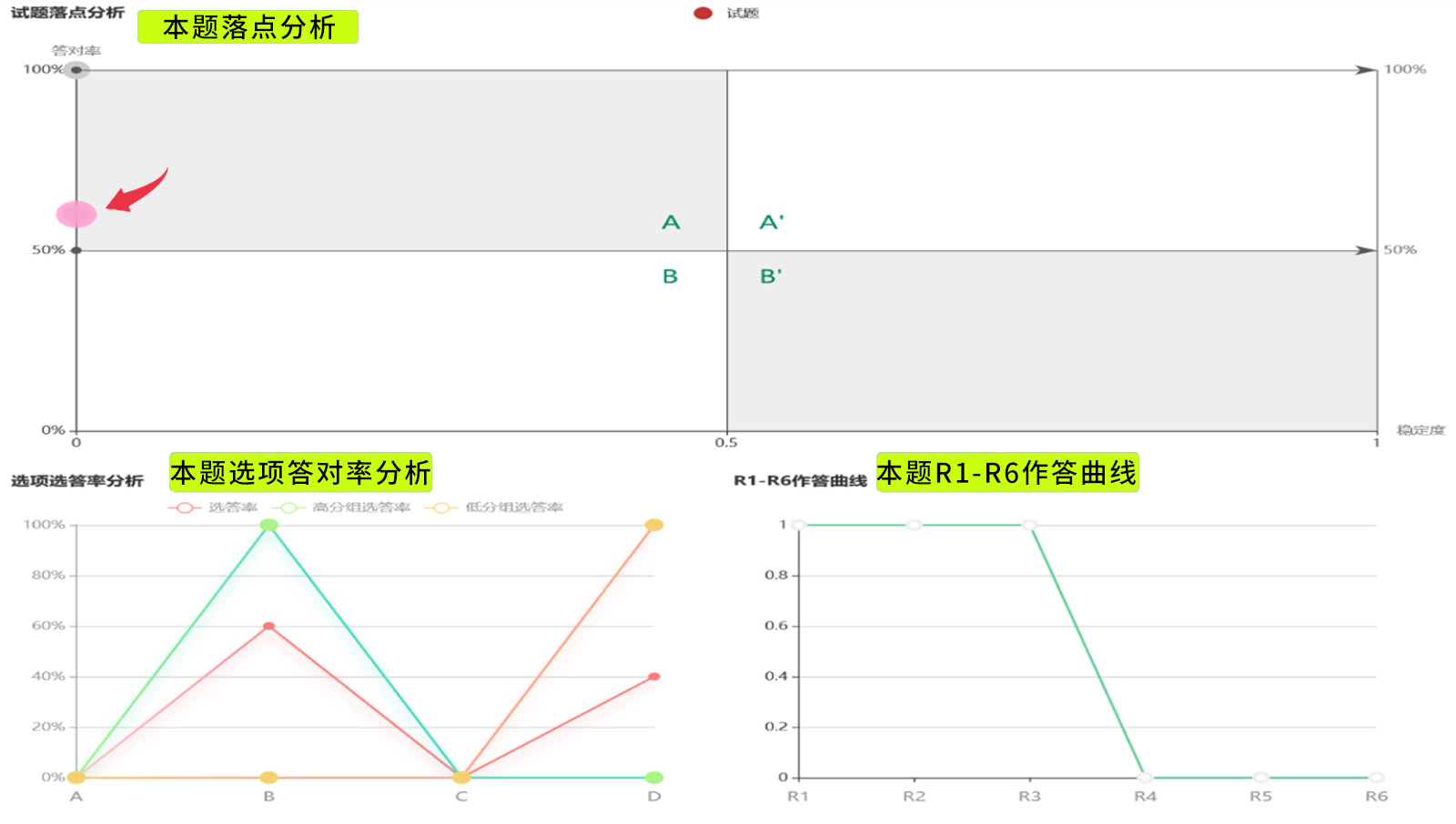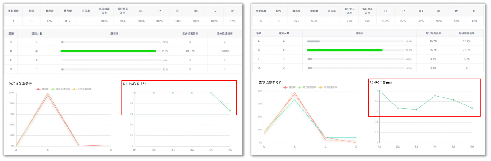 R1-R6作答曲線,可以補(bǔ)充難易度和鑒別度之不足,呈現(xiàn)從高分組至低分組的正答率變化。一個(gè)適當(dāng)、鑒別度高的題目,R1-R6的得分率應(yīng)該會越來越低,若R1至R5都得滿分(如下左圖),可能代表試題過于簡單。若R4的得分率遠(yuǎn)高于R3(如下右圖),則可能表示試題需要修正。