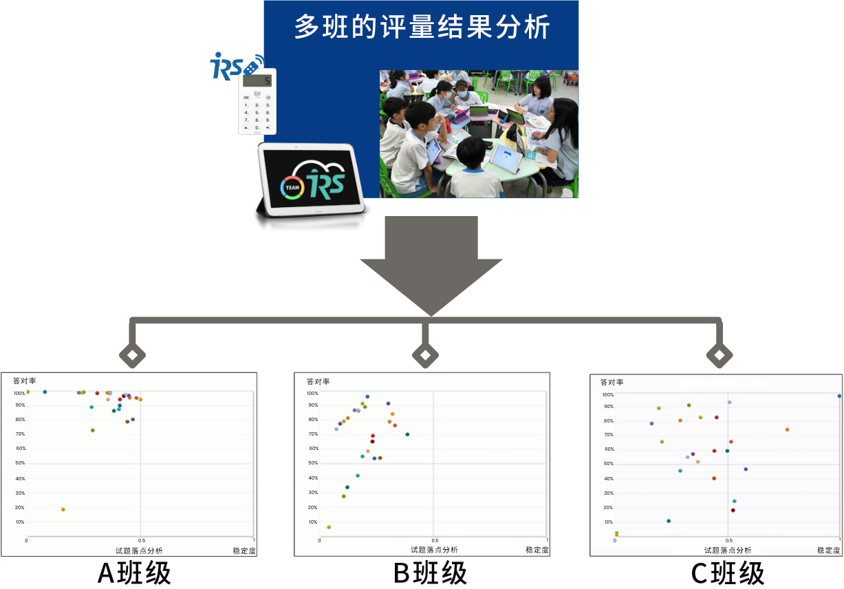 透過試題分析報(bào)告,可辨識試題的難易與合適度。它可診斷整份試卷中的每一個(gè)試題,經(jīng)由測驗(yàn)后試題質(zhì)量是可測出高成就學(xué)生、可分辨中等成就學(xué)生,或者試題中含有異質(zhì)成分、試題屬于拙劣設(shè)計(jì)、無法反映學(xué)生能力等,可藉此報(bào)告針對特定試題的設(shè)計(jì)與命題技巧做檢視分析。例如,下圖這個(gè)多班測驗(yàn)的范例,同一份試卷,讓不同的班級學(xué)生評量,從結(jié)果試題分析可看見差異,這份試卷對A班來說太簡單、B班剛剛好、C班太難,可以研討對不同班級設(shè)計(jì)不同的出題策略,成就每一個(gè)孩子。