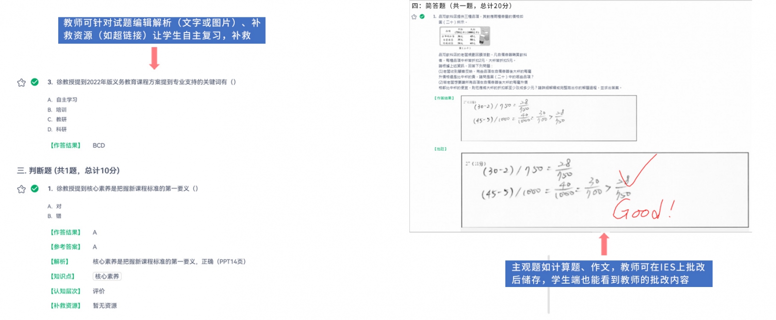 若試卷題目有包含填充、問答等主觀題型,測驗(yàn)結(jié)束后,老師需要先到IES平臺上進(jìn)行批閱、給分。