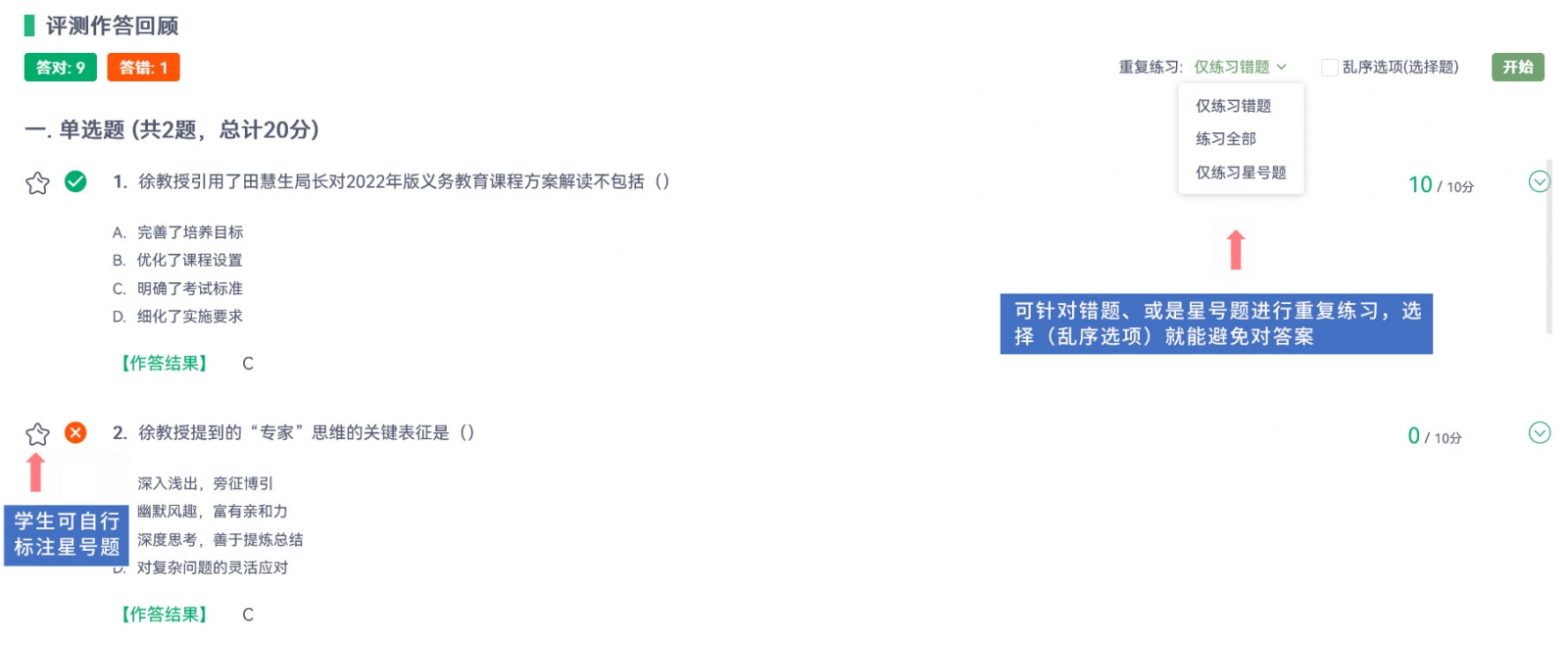 在瀏覽測驗(yàn)結(jié)果的過程中,學(xué)生可自行為需要加強(qiáng)關(guān)注的題目標(biāo)注星號,后續(xù)可針對錯(cuò)題、或是星號題進(jìn)行重復(fù)練習(xí),選擇「亂序選項(xiàng)」就能避免背答案!