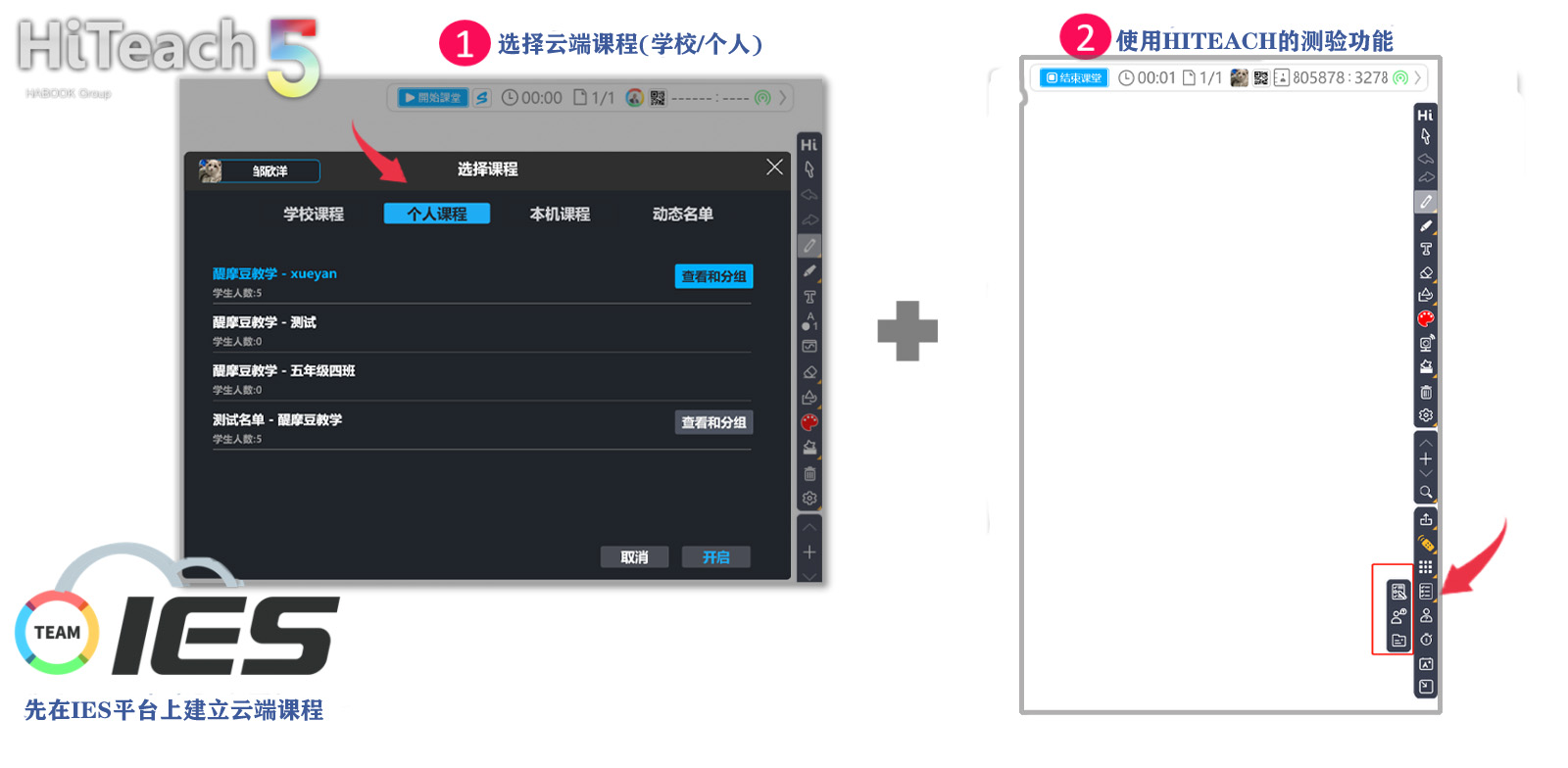 若要進(jìn)行clouDAS診斷分析,在HiTeach中開始課堂時(shí),選擇的課程名單必須是IES云端先建立好的個(gè)人課程或?qū)W校管理者所建立的學(xué)校課程,然后啟動HiTeach 5的測驗(yàn)功能后,測驗(yàn)結(jié)果就會同步上傳到IES平臺,并進(jìn)行clouDAS診斷分析。